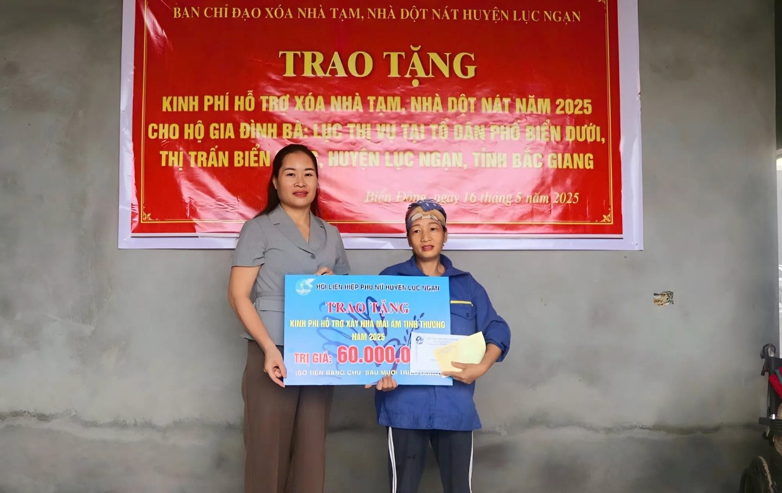 Đến thời điểm này, toàn tỉnh đã xây mới và sửa chữa 2.516 căn nhà; trong đó, Bắc Ninh (cũ) hỗ trợ 220 căn và 89 tỷ đồng giúp các tỉnh Bắc Kạn (cũ), Điện Biên, Đắk Nông (cũ); Bắc Giang (cũ) vận động xây dựng 2.296 căn và hỗ trợ 3 tỷ đồng giúp tỉnh Bến Tre xây 50 căn. Mỗi hộ được hỗ trợ 60 triệu đồng để xây mới, 30 triệu đồng để sửa chữa, trường hợp đặc biệt được hỗ trợ thêm 50 triệu đồng.