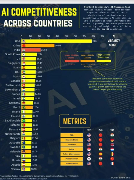 Việc Ấn Độ tăng 4 bậc chỉ trong vòng một năm, từ vị trí thứ 7 lên thứ 3, là một trong những diễn biến đáng chú ý nhất của bảng xếp hạng AI Vibrancy Index 2025. Báo cáo của Đại học Stanford đánh giá các quốc gia dựa trên 7 trụ cột, bao gồm nghiên cứu - phát triển, kinh tế, nhân lực, cơ sở hạ tầng, chính sách - quản trị, AI có trách nhiệm và mức độ chấp nhận của xã hội. Trong hầu hết các hạng mục, Ấn Độ đều ghi nhận mức cải thiện rõ rệt, đặc biệt là ở số lượng công trình nghiên cứu khoa học, đơn đăng ký bằng sáng chế liên quan đến AI, cũng như dòng vốn đầu tư và tạo việc làm trong lĩnh vực này.