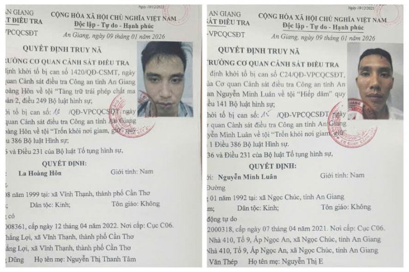 Văn phòng Cơ quan Cảnh sát điều tra Công an tỉnh An Giang đã chính thức ra quyết định truy nã đối với Nguyễn Minh Luân và La Hoàng Hôn về tội “Trốn khỏi nơi giam giữ”. Các biện pháp nghiệp vụ đang được thắt chặt tại các khu vực giáp ranh để ngăn chặn các đối tượng lẩn trốn ra khỏi địa bàn.