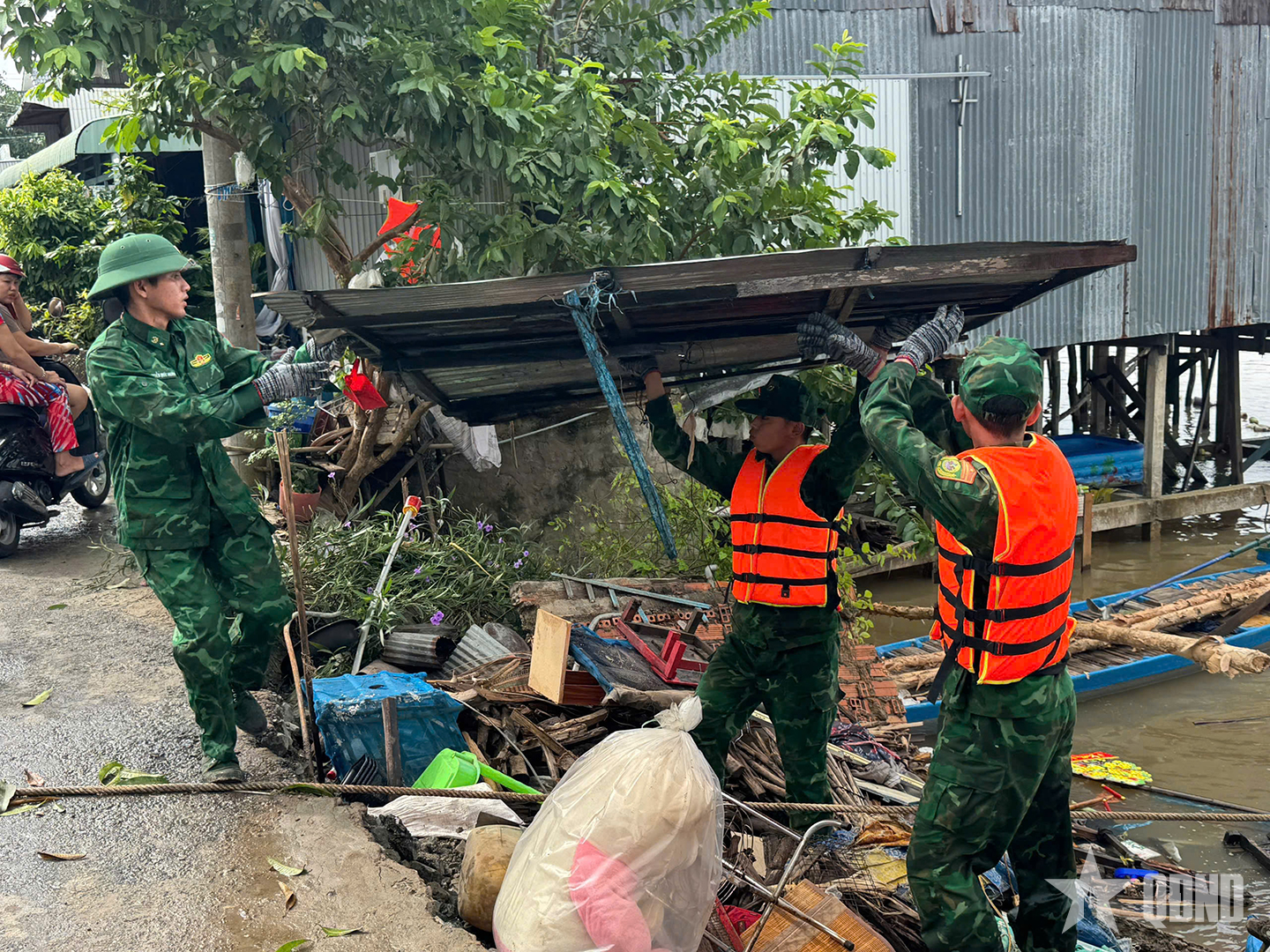 Đồn Biên phòng cửa khẩu Vĩnh Hội Đông (Ban chỉ huy Bộ đội Biên phòng tỉnh An Giang) dọn dẹp giúp người dân bị sập nhà do mưa dông.
