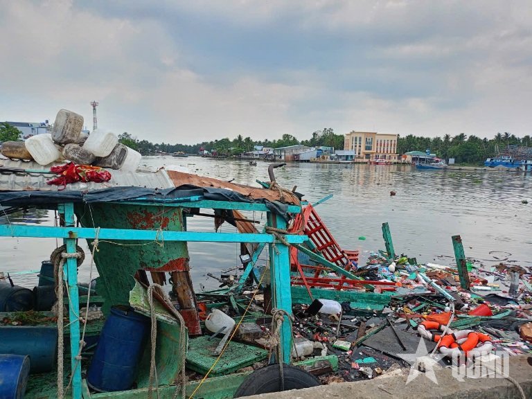 Hiện trường vụ cháy, nổ tàu cá tại khu vực Bến phà Tắc Cậu, tỉnh An Giang.