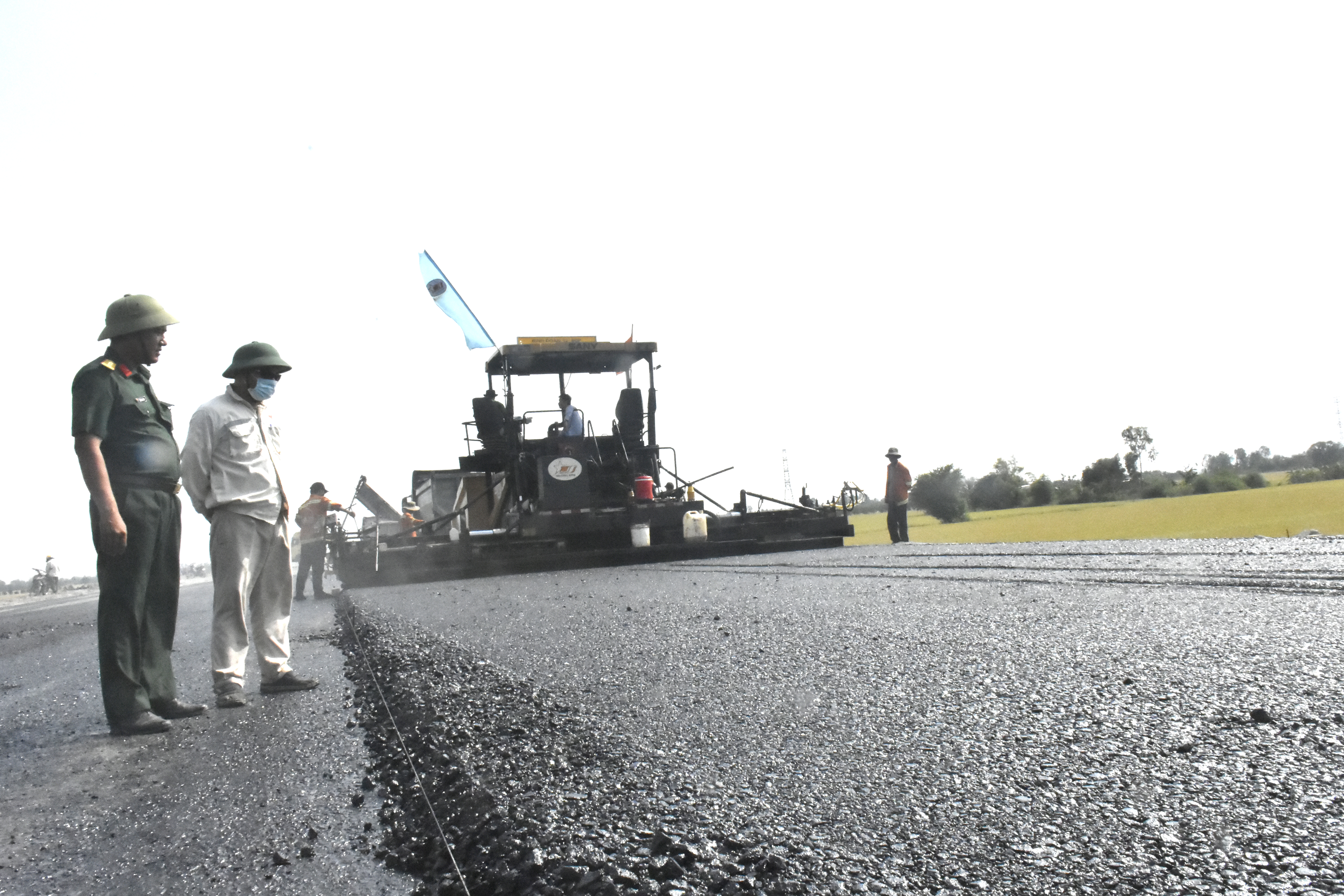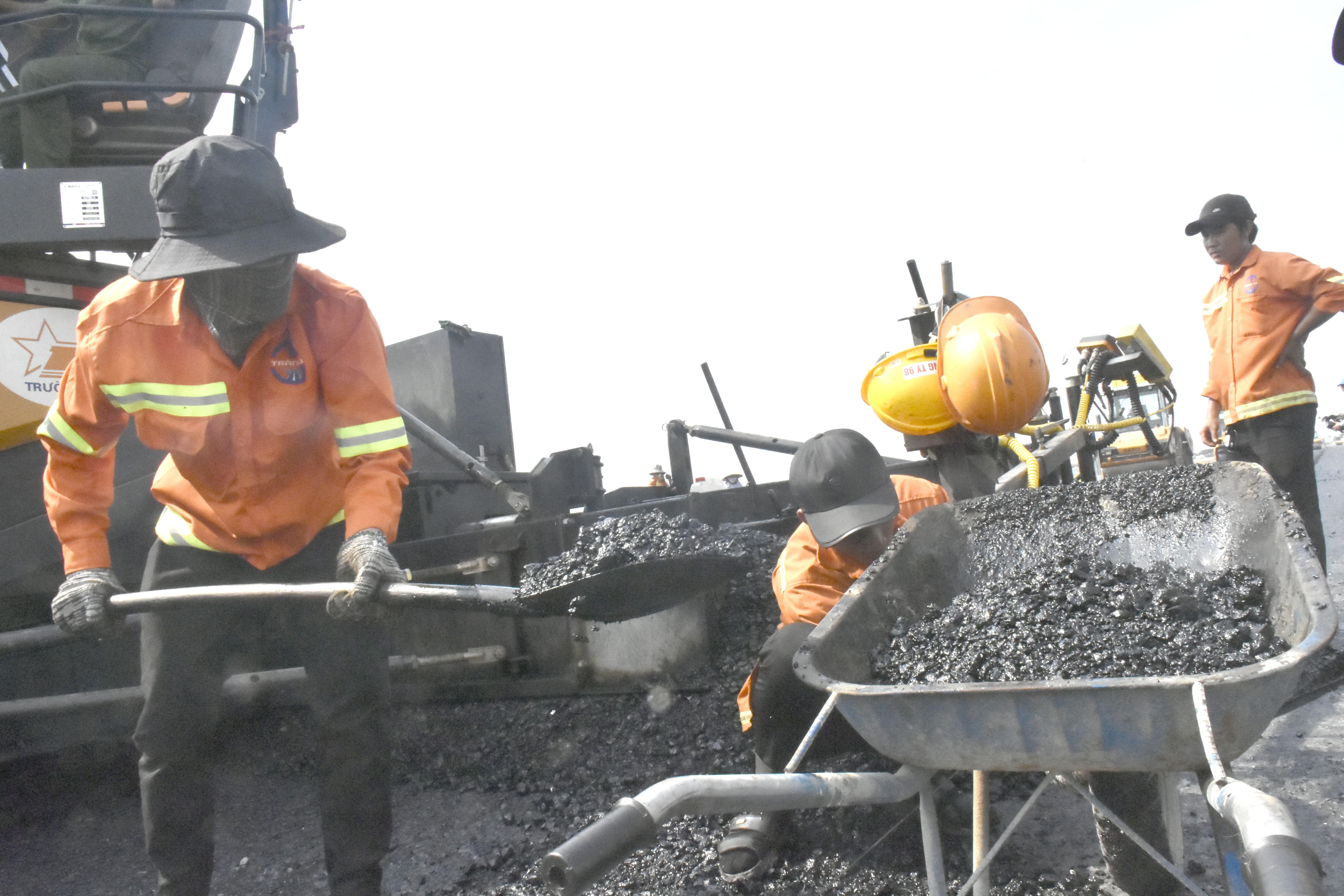 Cán bộ Tổng Công ty xây dựng Trường Sơn giám sát công tác rải bê tông nhựa trên công trường