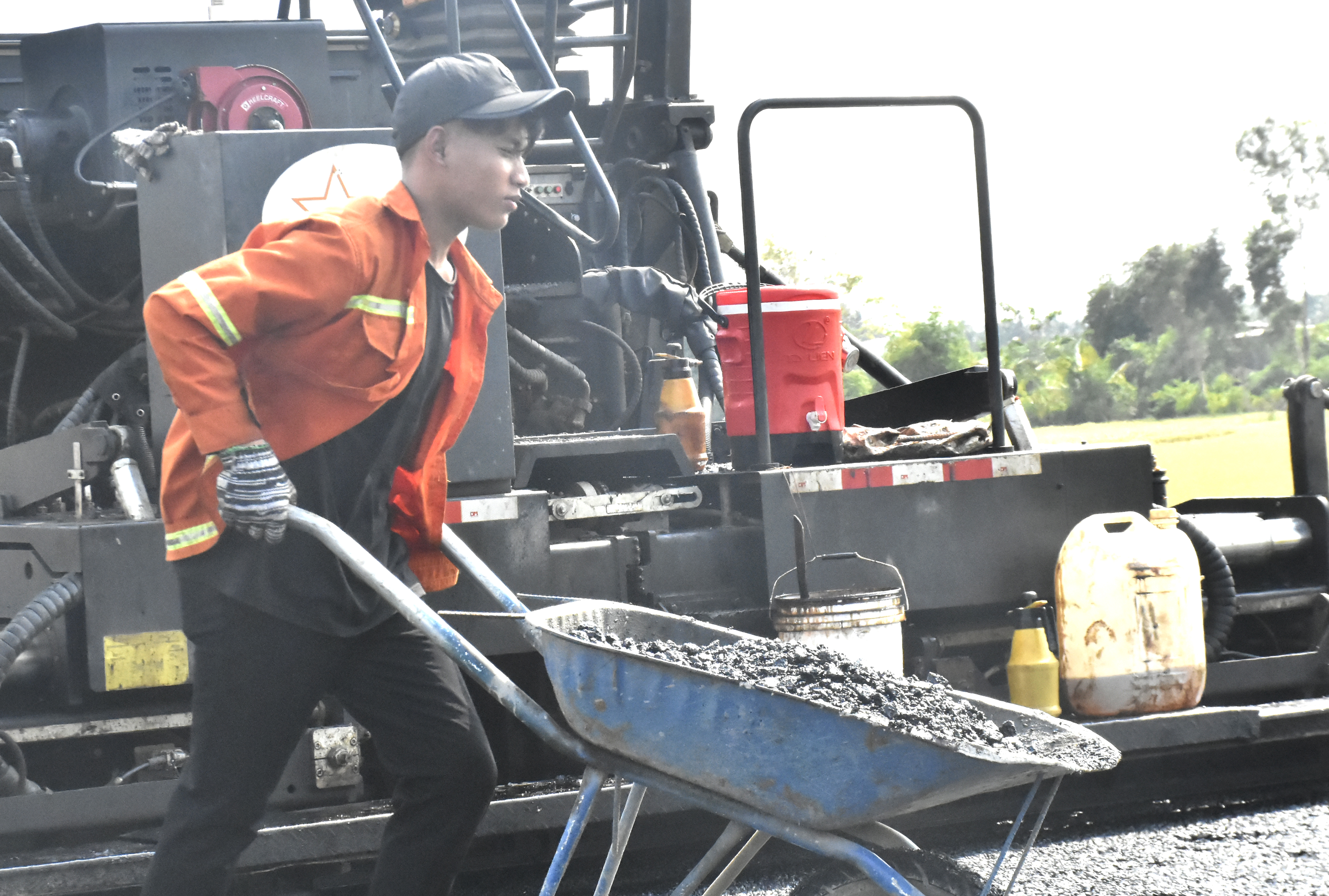 Công nhân vận chuyển bê tông nhựa mặt đường tại công trường