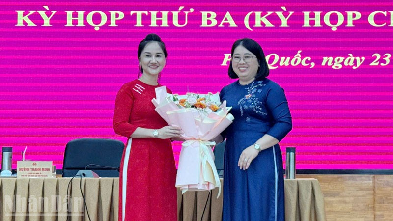 Lãnh đạo Hội đồng nhân dân đặc khu Phú Quốc tặng hoa chúc mừng bà Nguyễn Thị Kim Loan.