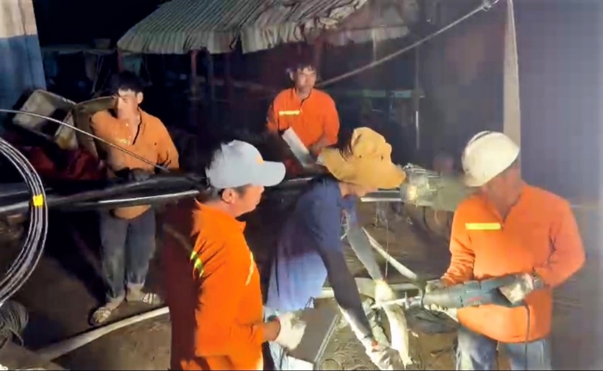 Các công nhân ngành điện An Giang nỗ lực khắc phục sự cố đứt cáp