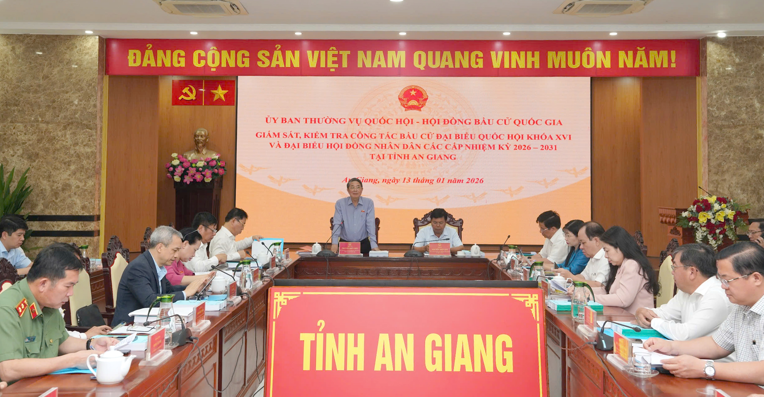 Sáng 13-1, Đoàn giám sát, kiểm tra công tác bầu cử của Ủy ban Thường vụ Quốc hội, Hội đồng Bầu cử quốc gia do đồng chí Nguyễn Đức Hải, Ủy viên Ban Chấp hành Trung ương Đảng, Phó Chủ tịch Quốc hội, Ủy viên Hội đồng Bầu cử quốc gia, làm trưởng đoàn có buổi làm việc với tỉnh An Giang về công tác chuẩn bị bầu cử ĐBQH khóa XVI và đại biểu HĐND các cấp nhiệm kỳ 2026-2031.