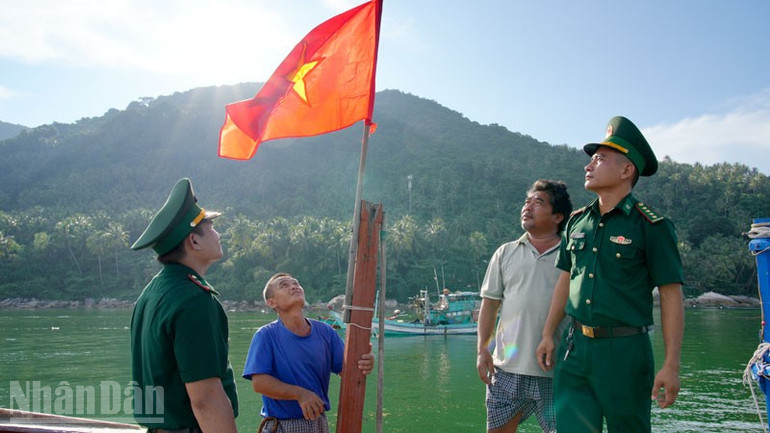 Đồn Biên phòng Hòn Sơn thay cờ Tổ quốc trên tàu cá ngư dân vận động khai thác thủy sản đúng quy định của pháp luật. (Ảnh: TIẾN VINH).
