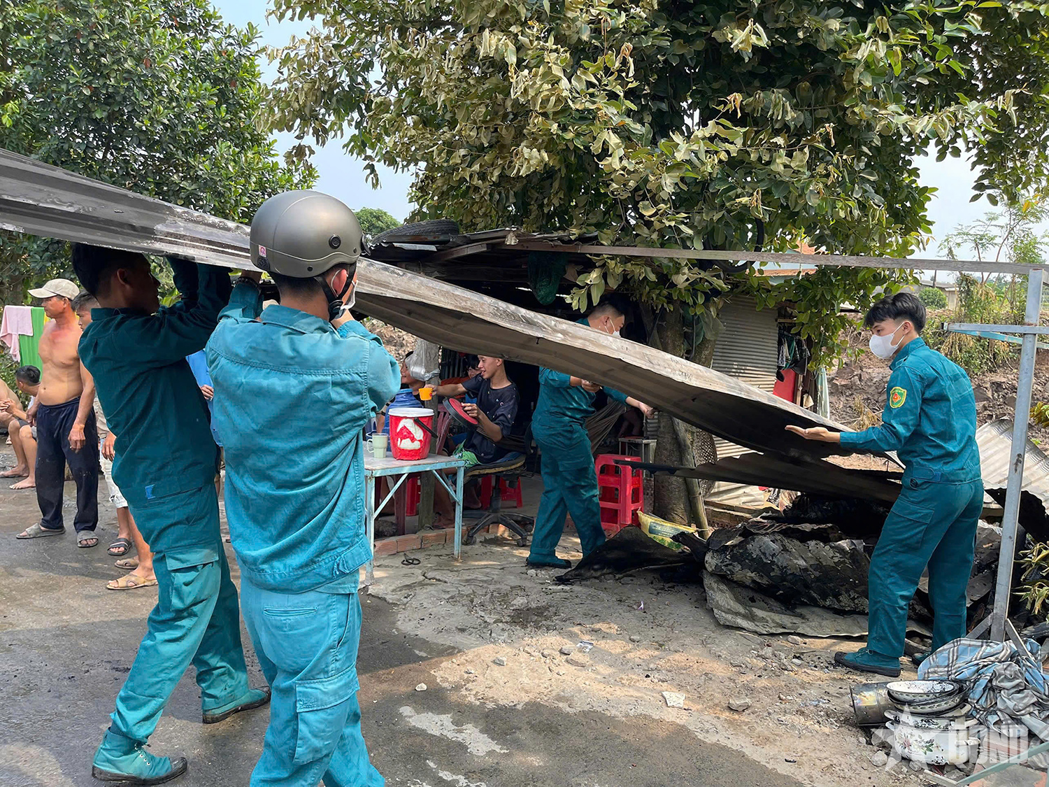 Lực lượng dân quân xã Chợ Mới (tỉnh An Giang) tham gia hỗ trợ người dân bị ảnh hưởng bởi vụ cháy.