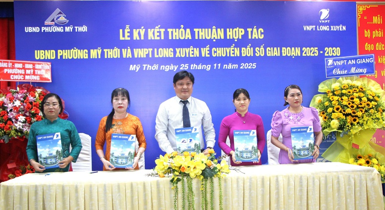 Lễ ký kết thỏa thuận hợp tác giữa UBND phường Mỹ Thới ký kết với VNPT Long Xuyên thực hiện chuyển đổi số trên địa bàn - Ảnh: VGP/ Thanh Bình