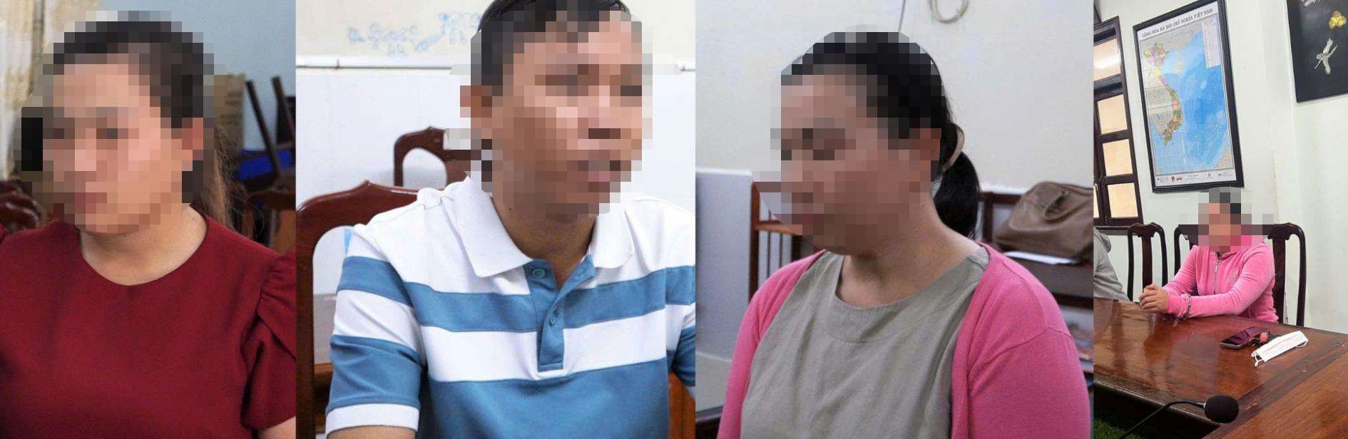 Từ trái qua phải: Các bị can Nguyễn Thị Xuân An, Phạm Quang Châu, Nguyễn Thị Xuân Tuyết, Nguyễn Nhật Phương tại cơ quan công an