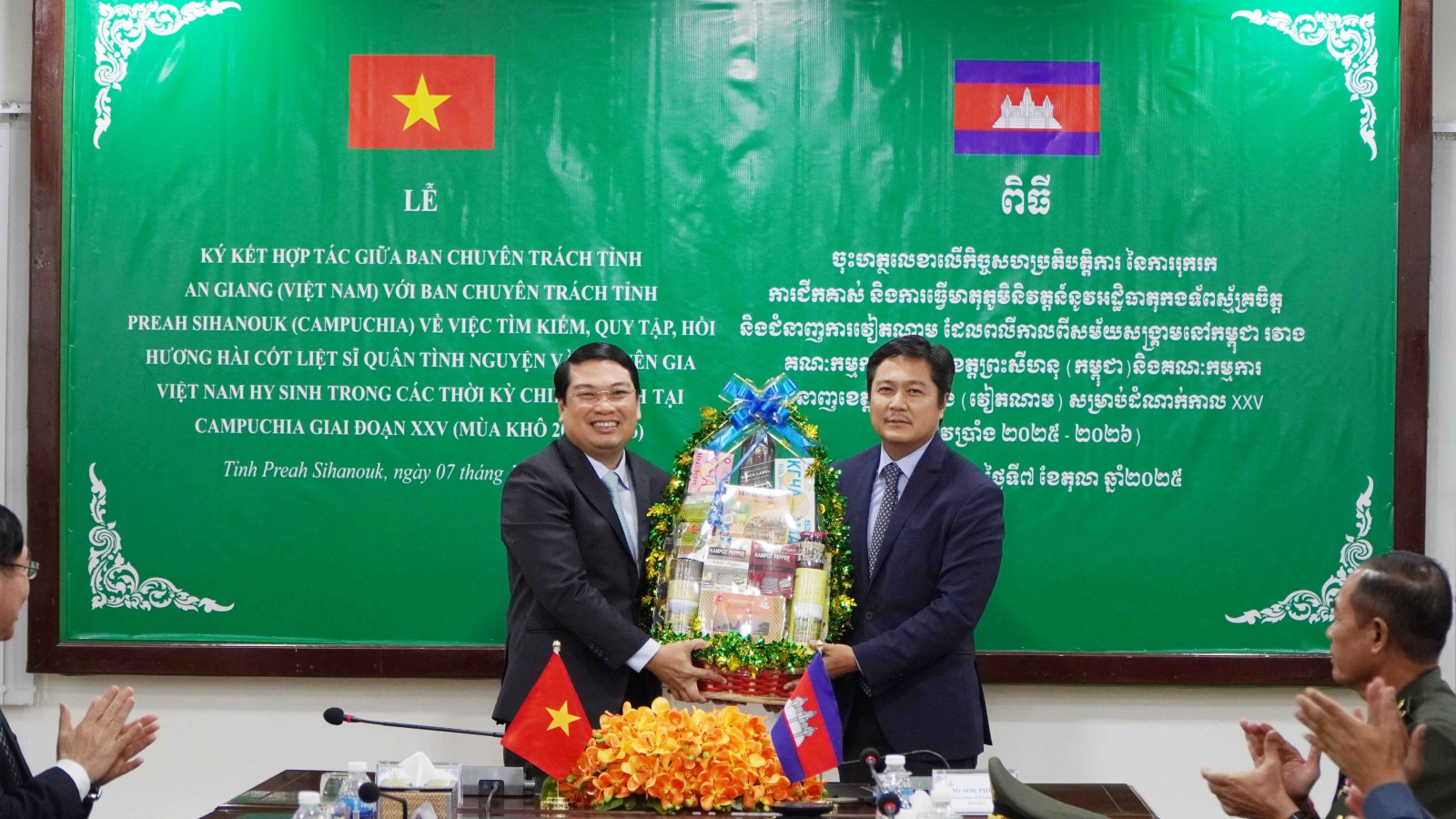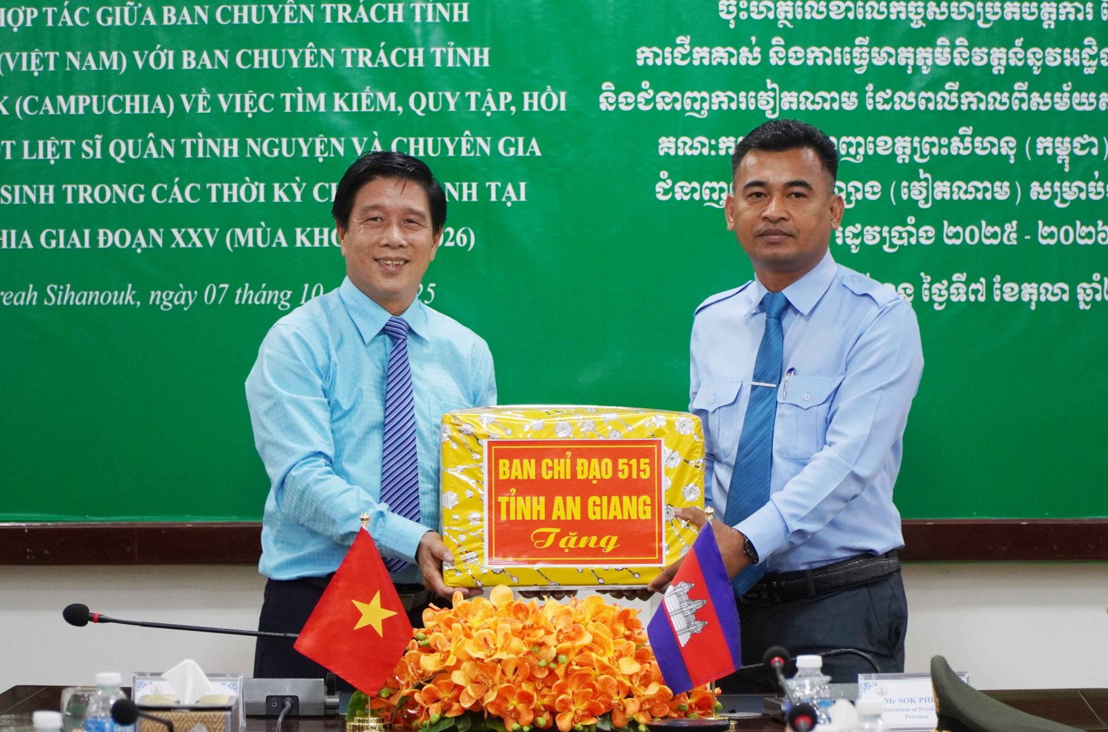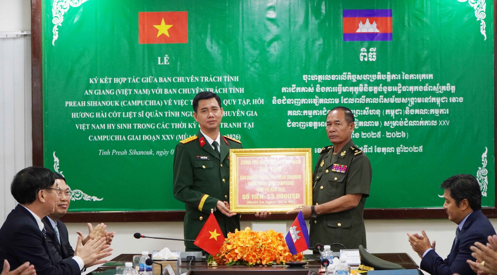 Dịp này, Ban Chuyên trách tỉnh An Giang được ủy quyền của Ban Chuyên trách Chính phủ Việt Nam trao kinh phí hỗ trợ Ban Chuyên trách tỉnh Preah Sihanouk trong phối hợp tổ chức các hoạt động giúp Đội K92 tìm kiếm, quy tập hài cốt liệt sĩ quân tình nguyện và chuyên gia Việt Nam hy sinh trong các thời kỳ chiến tranh tại Campuchia trên địa bàn tỉnh Preah Sihanouk, mùa khô 2025 - 2026.