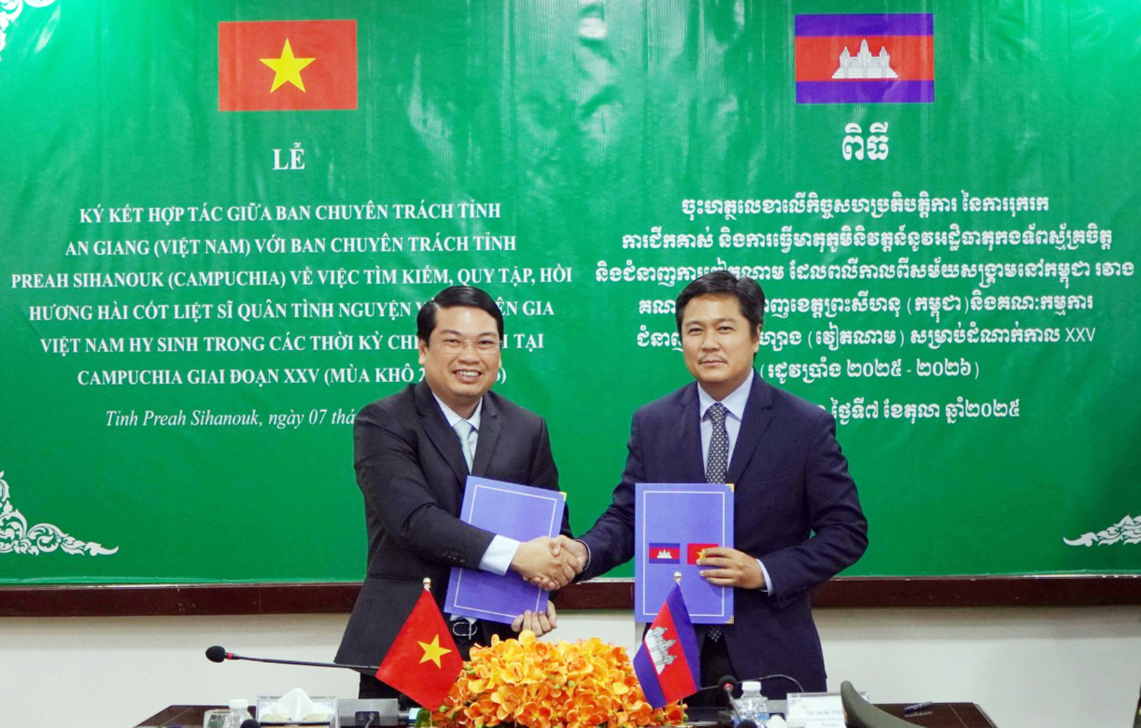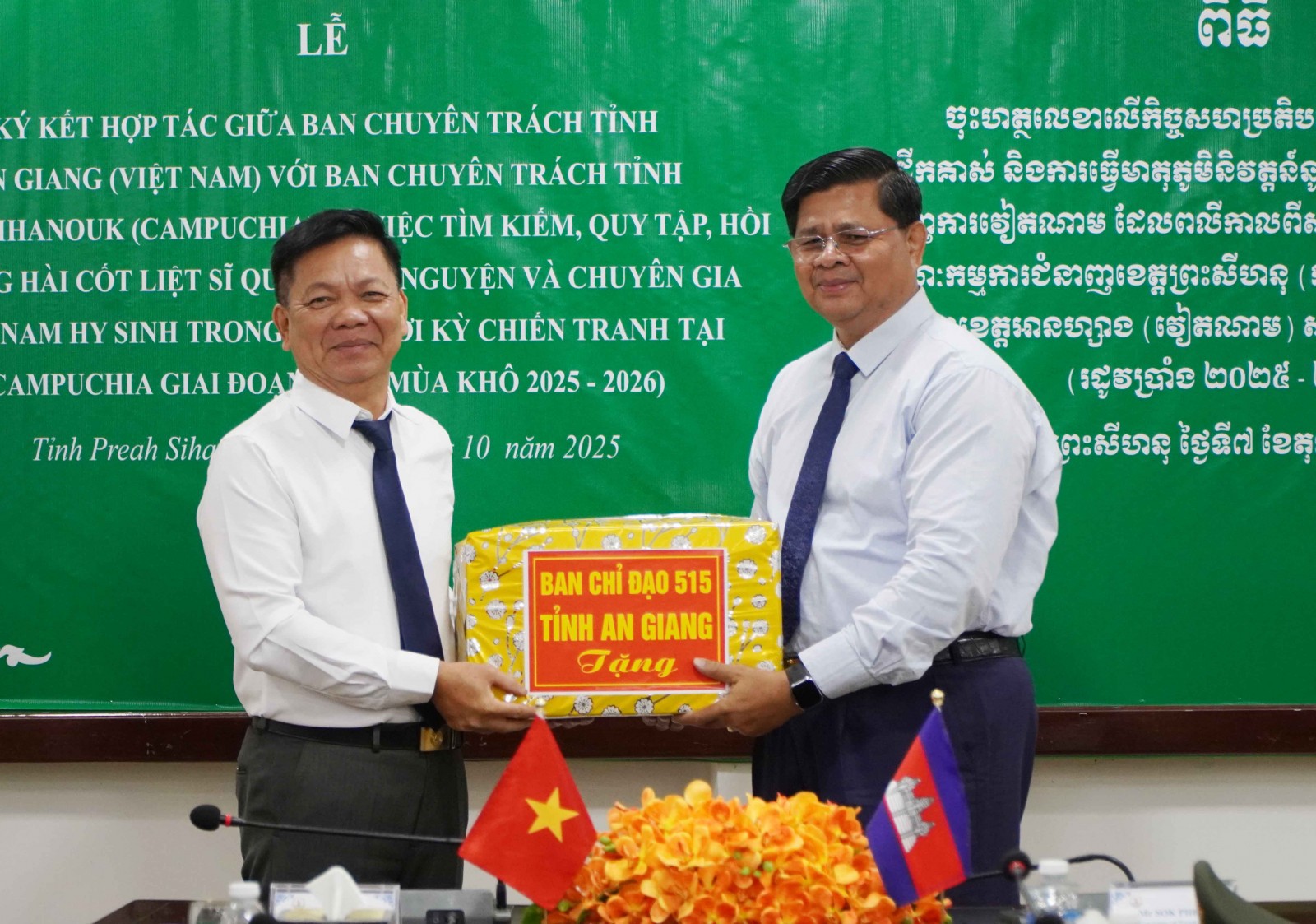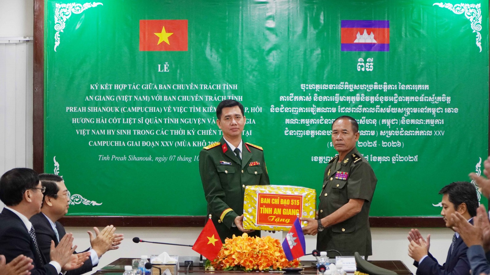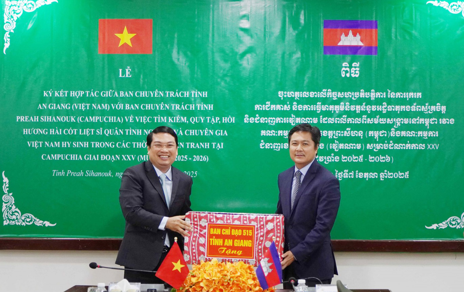 Dịp này, Ban Chuyên trách tỉnh An Giang được ủy quyền của Ban Chuyên trách Chính phủ Việt Nam trao kinh phí hỗ trợ Ban Chuyên trách tỉnh Preah Sihanouk trong phối hợp tổ chức các hoạt động giúp Đội K92 tìm kiếm, quy tập hài cốt liệt sĩ quân tình nguyện và chuyên gia Việt Nam hy sinh trong các thời kỳ chiến tranh tại Campuchia trên địa bàn tỉnh Preah Sihanouk, mùa khô 2025 - 2026.