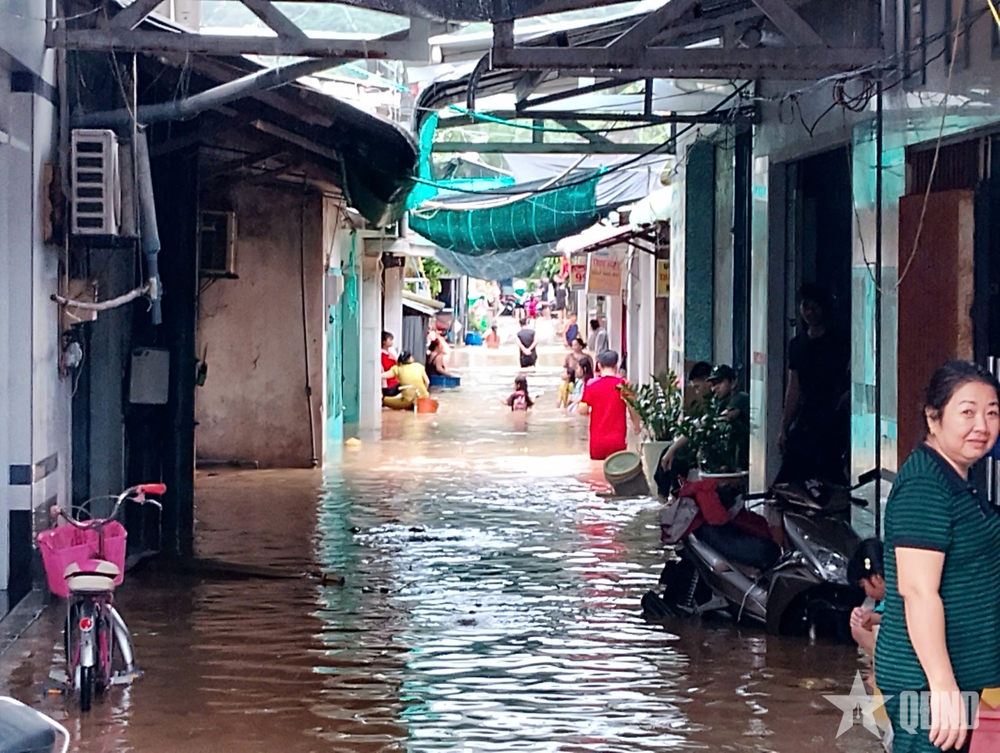 Tại khu vực trung tâm đặc khu, nước dâng cao tràn vào nhà dân, nhiều gia đình vận chuyển đồ đạc chất lên cao, dùng bao cát chắn nước tràn vào nhà.