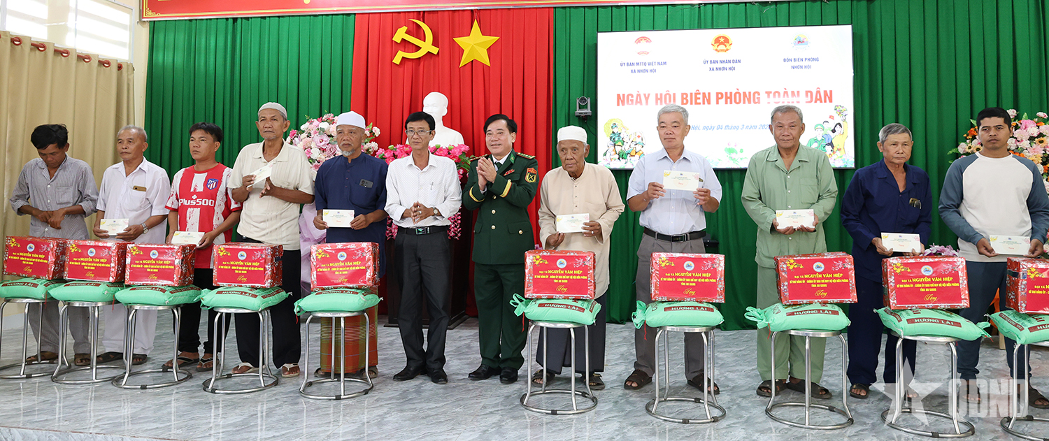 Đại tá Nguyễn Văn Hiệp, Phó chính ủy Bộ Chỉ huy Quân sự tỉnh, Chính ủy Ban Chỉ huy Bộ đội Biên phòng tỉnh An Giang và lãnh đạo địa phương tặng quà người dân có hoàn cảnh khó khăn trên địa bàn xã Nhơn Hội.