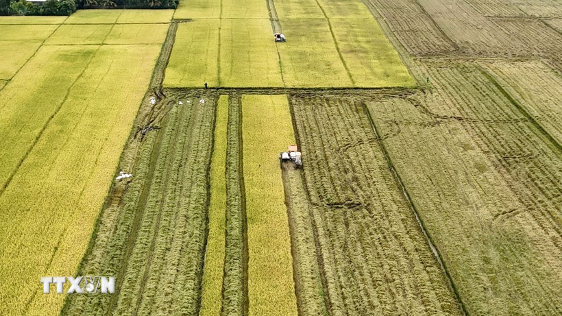 Thu hoạch trên cánh đồng lúa chín vàng tại An Giang. (Ảnh: Thanh Sang/TTXVN)