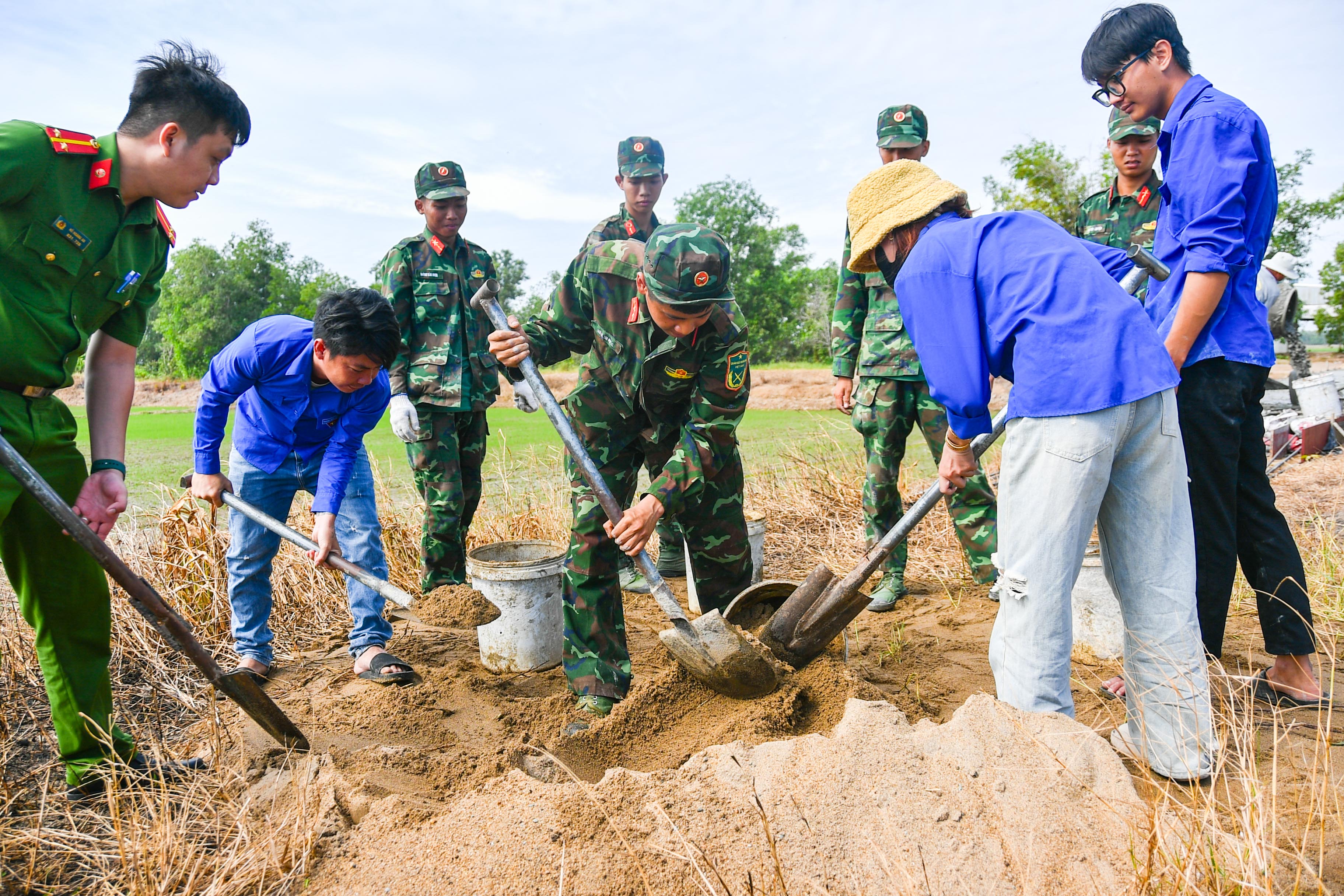Cán bộ, chiến sĩ tham gia đổ bê tông cầu giao thông nông thôn Kênh D, ấp Tân Điền