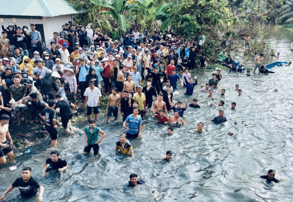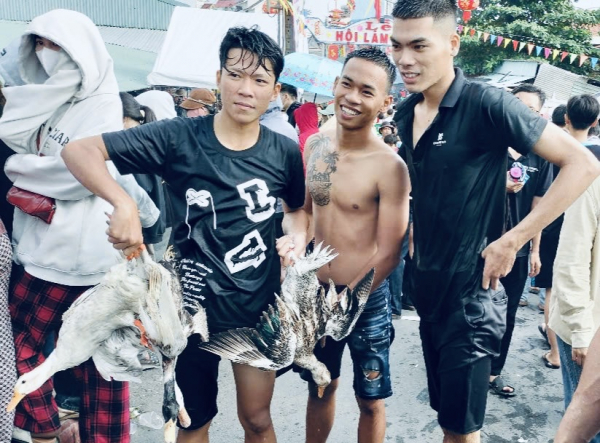 Hàng ngàn người hào hứng với lễ hội và tham gia nhiệt tình trò chơi bắt vịt trên sông.