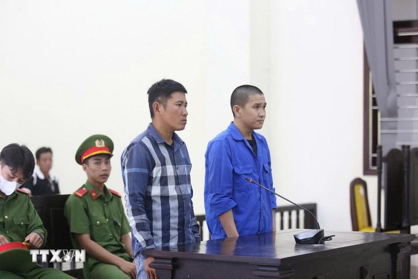 Hai bị cáo Lê Hữu Trọng và Lê Thanh Sang tại phiên tòa sơ thẩm do Tòa án Nhân dân tỉnh Tây Ninh xét xử về tội “giết người.” (Ảnh: TTXVN phát)