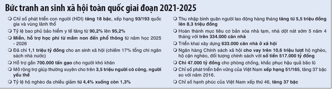 Cùng những căn nhà đó, chăm lo an sinh xã hội luôn được Đảng, Nhà nước đặc biệt quan tâm. Giai đoạn 2021-2025, trong bối cảnh tình hình thế giới diễn biến phức tạp, khó lường, đặc biệt đại dịch Covid-19 gây ra hậu quả nặng nề, song toàn bộ chỉ tiêu về xã hội, an sinh xã hội của nước ta đều đạt và vượt. Việt Nam đã kiểm soát thành công và khắc phục hiệu quả đại dịch Covid-19 với tinh thần “Xác định đặt sức khỏe, tính mạng của nhân dân lên trên hết, trước hết”, được quốc tế ghi nhận, đánh giá cao. Chỉ số phát triển con người (HDI) tăng 18 bậc, xếp hạng 93/193 quốc gia và vùng lãnh thổ. Mạng lưới cơ sở y tế phát triển mạnh, chất lượng khám, chữa bệnh được nâng lên; tỷ lệ bao phủ bảo hiểm y tế tăng lên 95,2%; miễn, hỗ trợ học phí từ mầm non đến phổ thông từ năm học 2025-2026. Cùng với đó, các chính sách người có công, an sinh xã hội, giảm nghèo được triển khai toàn diện và đạt nhiều kết quả nổi bật với tinh thần “không để ai bị bỏ lại phía sau”.