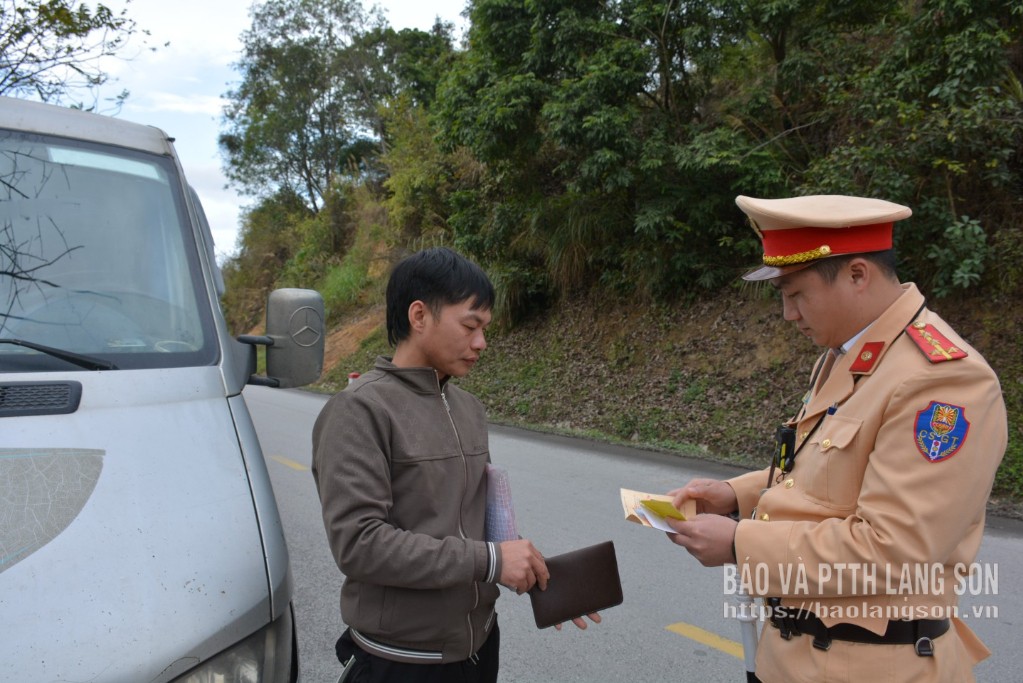 Lực lượng cảnh sát giao thông Công an tỉnh kiểm tra hành chính lái xe vận tải hành khách trên tuyến quốc lộ 4A, đoạn qua địa bàn xã Văn Lãng