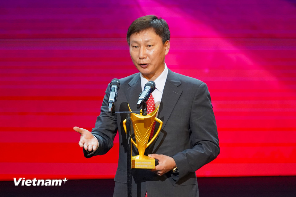 Thầy Kim gửi lời chúc mừng năm mới bằng tiếng Việt đến người hâm mộ sau khi nhận giải thưởng "Chuyên gia nước ngoài xuất sắc của năm." (Ảnh: Việt Anh/Vietnam+)