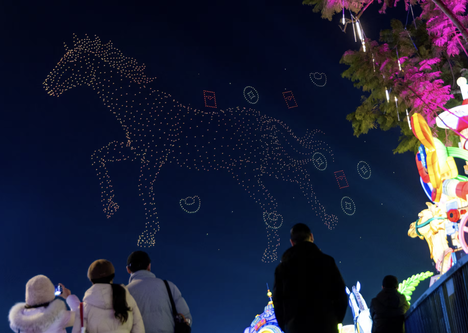 Người dân theo dõi màn trình diễn máy bay không người lái (drone) tại Lễ hội Đèn lồng Quốc tế Tự Cống lần thứ 32 trước thềm Tết Nguyên đán chào đón năm Ngọ, tại Tự Cống, tỉnh Tứ Xuyên, Trung Quốc, ngày 23/1. Ảnh: REUTERS/Maxim Shemetov.