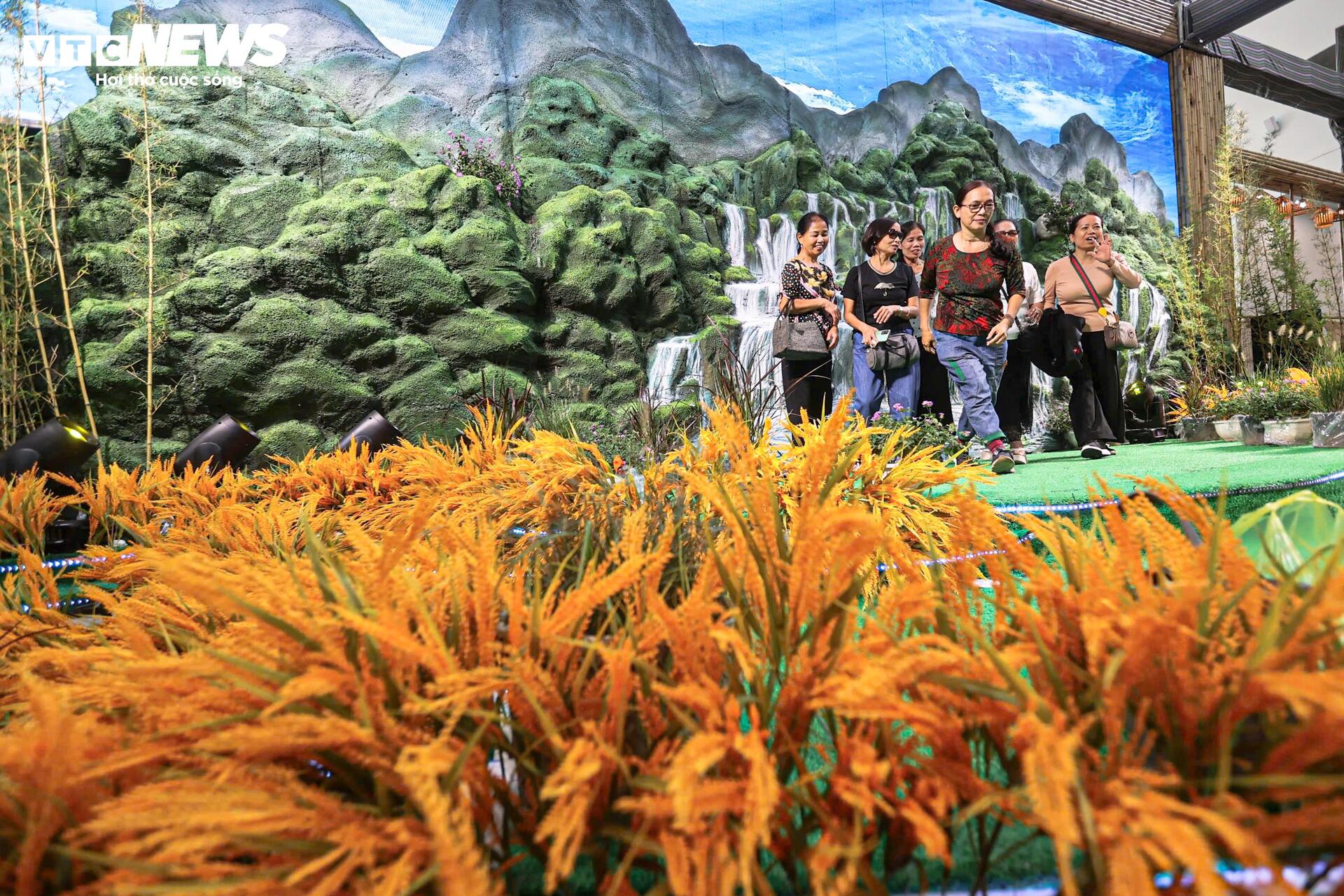 Ngay cạnh đó, gian hàng Cao Bằng lại khiến nhiều người trầm trồ khi tái hiện khung cảnh thác Bản Giốc và mùa lúa chín vàng ươm trên những triền đồi.