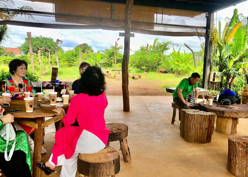 Xế trưa khi chúng tôi ghé quán sân vườn để thưởng thức cà phê Tây Nguyên, tiếng sáo réo rắt và màn livestream của Sùng A Dũng như "thổi hồn" khiến không gian văn hóa cồng chiêng thêm sống động.