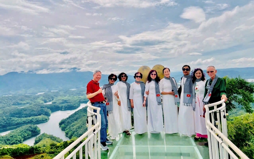 Nhóm khách du lịch Hà Nội, Thành phố Hồ Chí Minh trải nghiệm tham quan cầu kính tại khu du lịch Tà Đùng Topview. Ảnh: Sùng A Dũng
