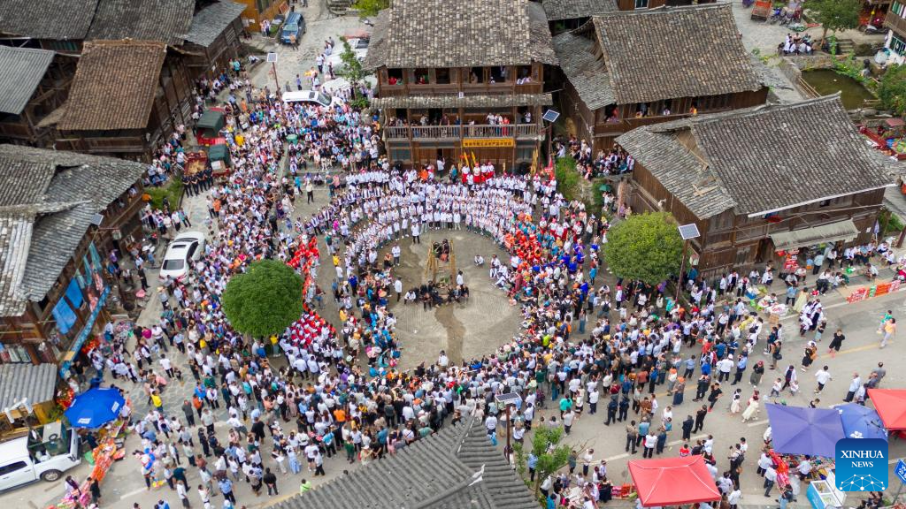 Toàn cảnh làng Hoàng Cương thuộc Châu tự trị dân tộc Miêu và Đồng Kiềm Đông Nam, tỉnh Quý Châu, nhìn từ trên cao ngày 20/7/2024. Ngôi làng này còn giữ được nét nguyên sơ, cổ kính.