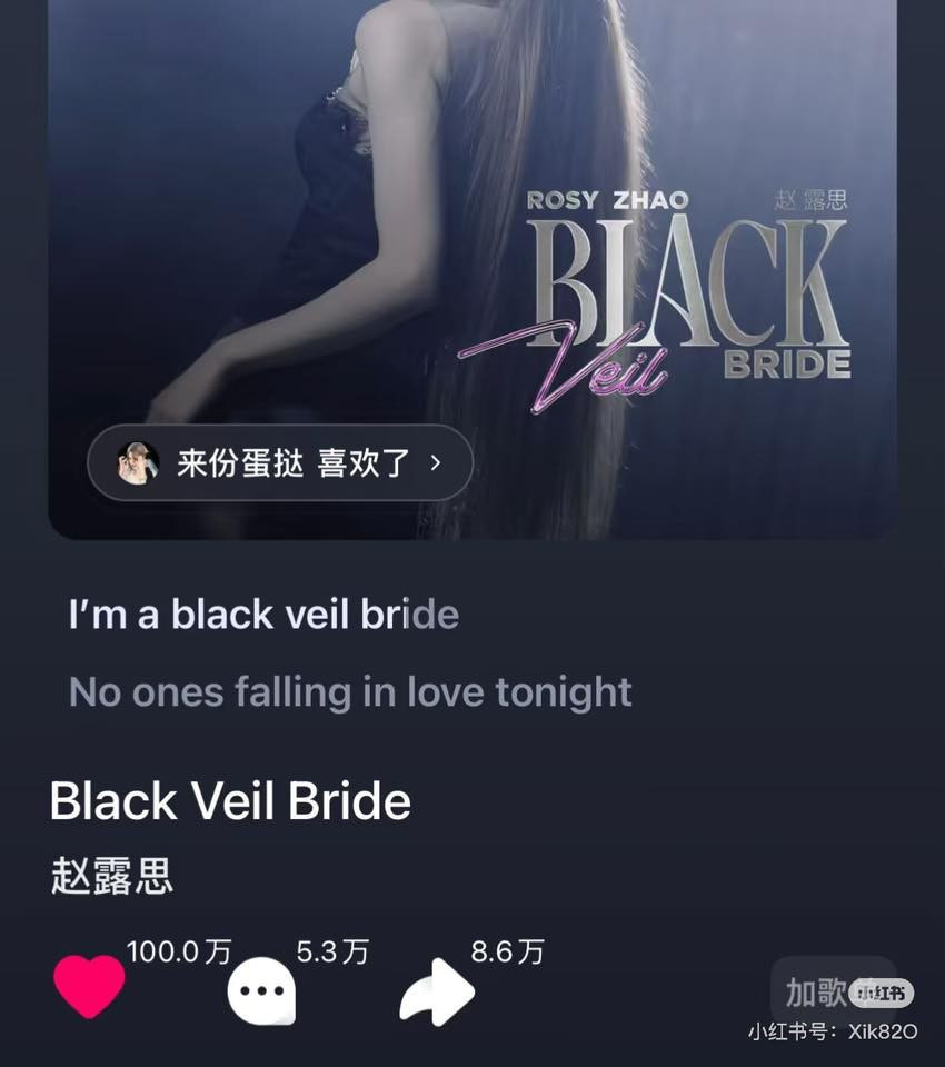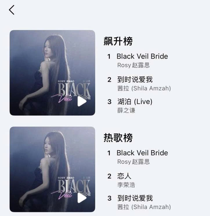 Black Veil Bride không chỉ gây chú ý với visual “tràn màn hình” của Triệu Lộ Tư mà còn có thành tích ấn tượng. Ca khúc này đứng đầu BXH Thịnh hành QQ Music, phá mốc 1 triệu lượt yêu thích sau 25 giờ và trở thành xu hướng tại nhiều quốc gia châu Á như Malaysia, Indonesia, Thái Lan, Philippines... Hashtag #blackveilbride cũng vượt 100 triệu lượt xem trên Douyin chỉ trong vòng một ngày.