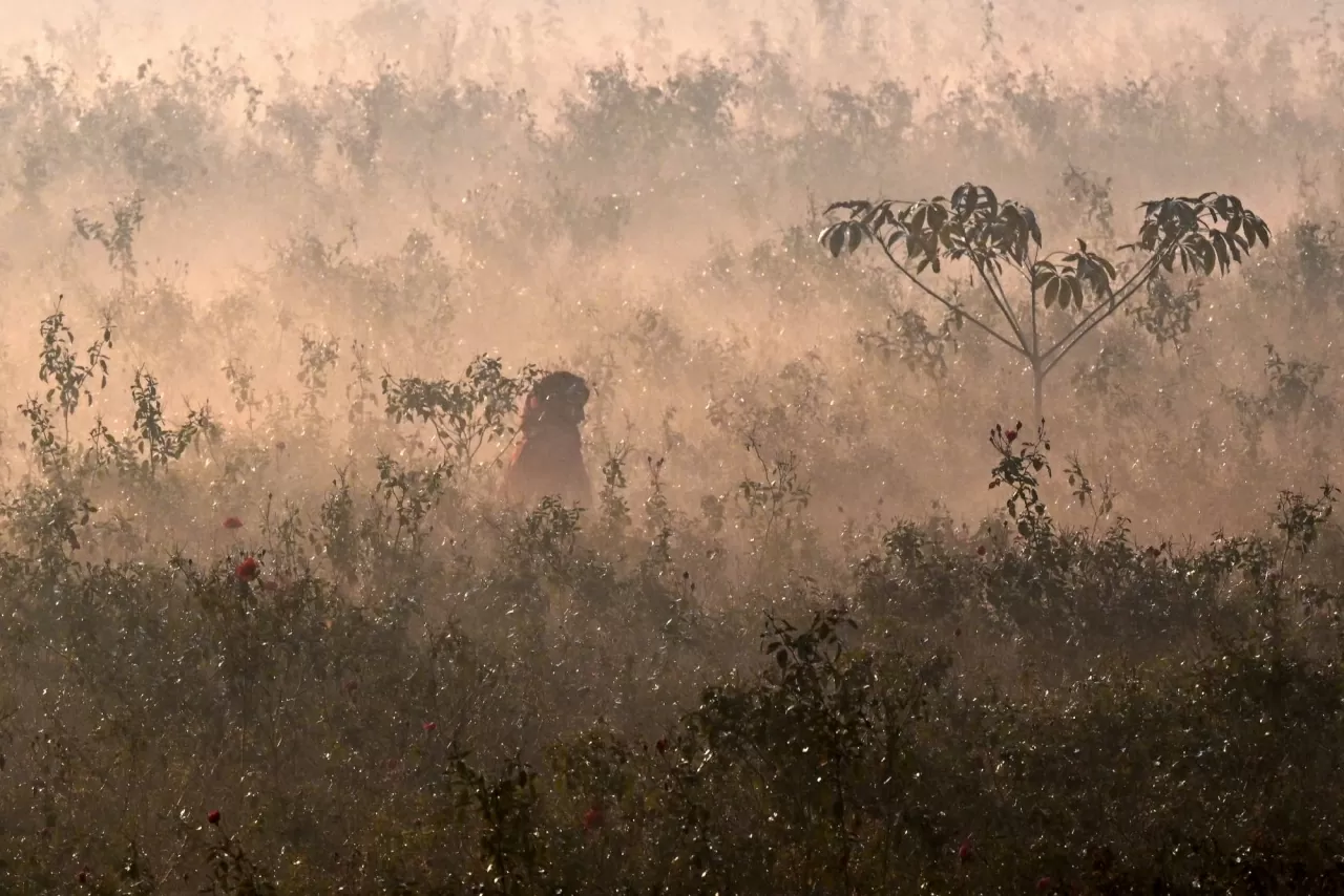 Một công nhân hái hoa hồng trên cánh đồng giữa làn sương mù ô nhiễm dày đặc ở Lahore, Pakistan. (Nguồn: The Guardian)