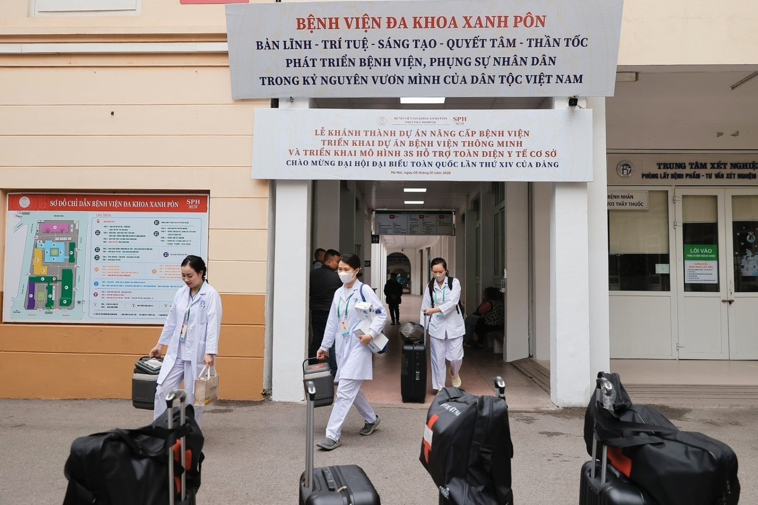 Bệnh viện đa khoa Xanh Pôn bố trí 01 tổ y tế gồm 2 bác sĩ, 2 điều dưỡng và 1 lái xe và xe cứu thương trực 24/24 giờ tại chỗ từ 13h ngày 18/01/2026 đến khi kết thúc Đại hội, sẵn sàng tham gia cấp cứu. Ảnh: Minh Quyết - TTXVN