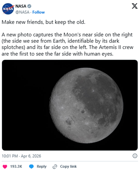 Phần tối Mặt trăng là khu vực mà con người chưa từng trực tiếp nhìn thấy trước đây. Hình ảnh chụp được từ Artemis 2 được đăng tải trên mạng xã hội và có thể sớm đưa vào thư viện đa phương tiện của NASA. Phi hành đoàn Artemis 2 là những người may mắn đầu tiên quan sát phần tối bằng mắt thường.