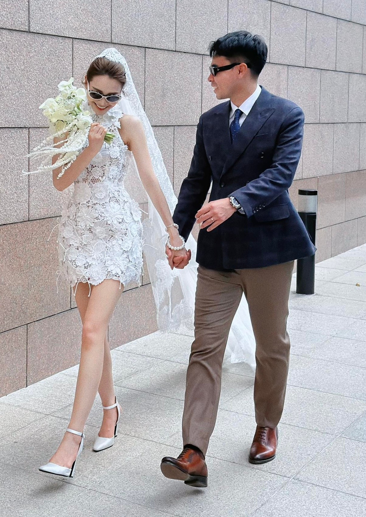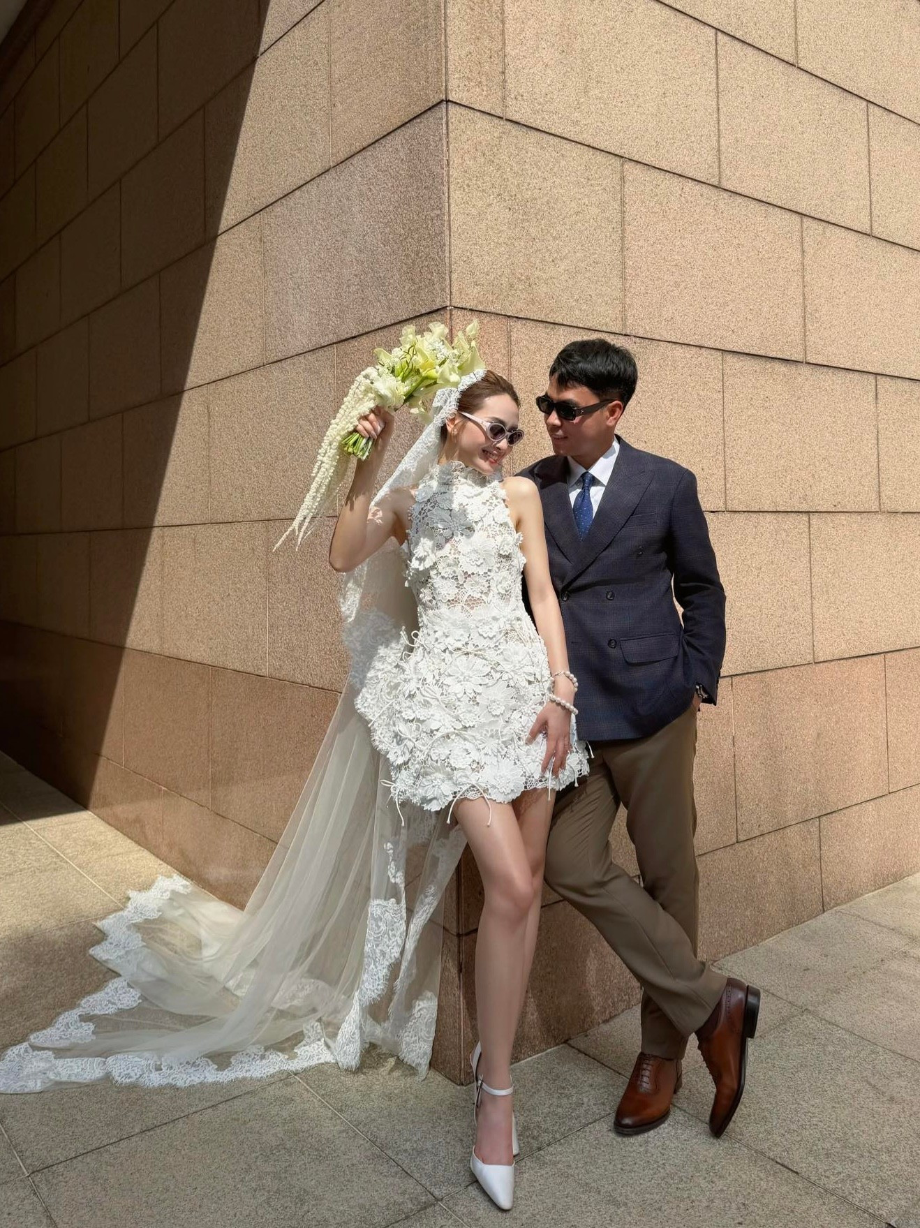 Tối 14/2, đúng ngày Lễ tình nhân, MC Huyền Trang đăng ảnh cưới với cầu thủ Đức Huy. MC Huyền Trang mặc váy cưới dáng ngắn, phong cách hiện đại. Cầu thủ Đức Huy diện vest, chọn cà vạt xanh lam. Hai người cùng đeo phụ kiện kính râm đồng điệu.