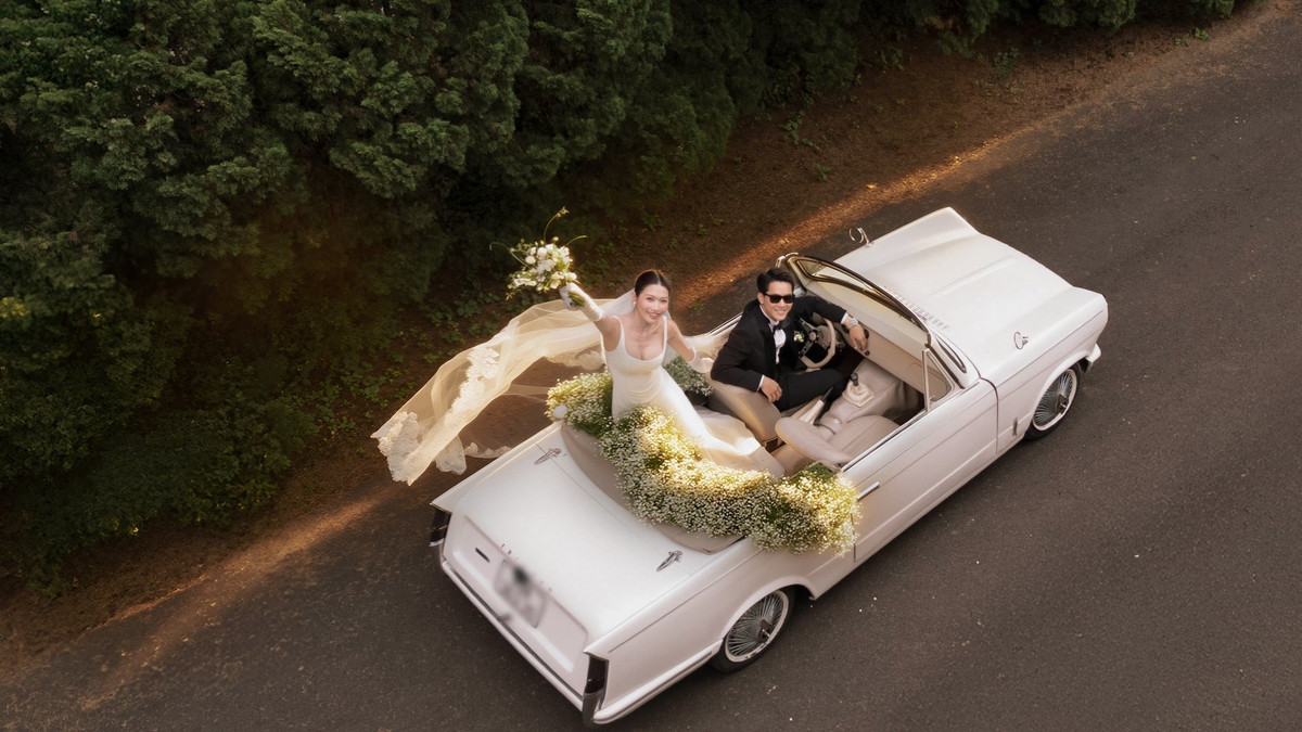 Đôi uyên ương tạo dáng trên chiếc xe mui trần cổ điển.