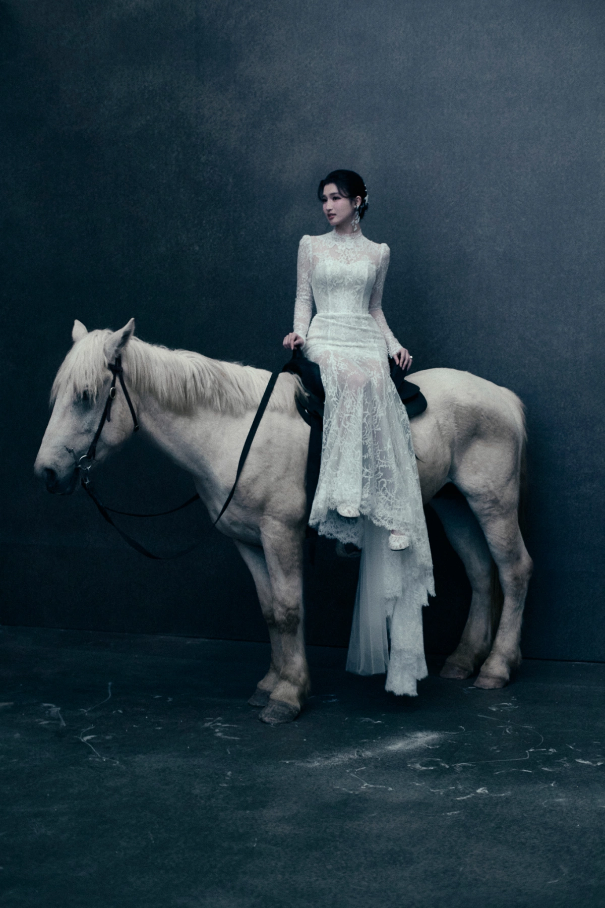 Đáng chú ý, loạt ảnh đầu tiên được hé lộ còn có sự xuất hiện của linh vật năm Bính Ngọ. Phương Nhi diện váy ren xuyên thấu, tạo dáng trên lưng ngựa, trong khi chú rể lựa chọn trang phục đồng điệu, mang đến tổng thể hài hòa, tinh tế.