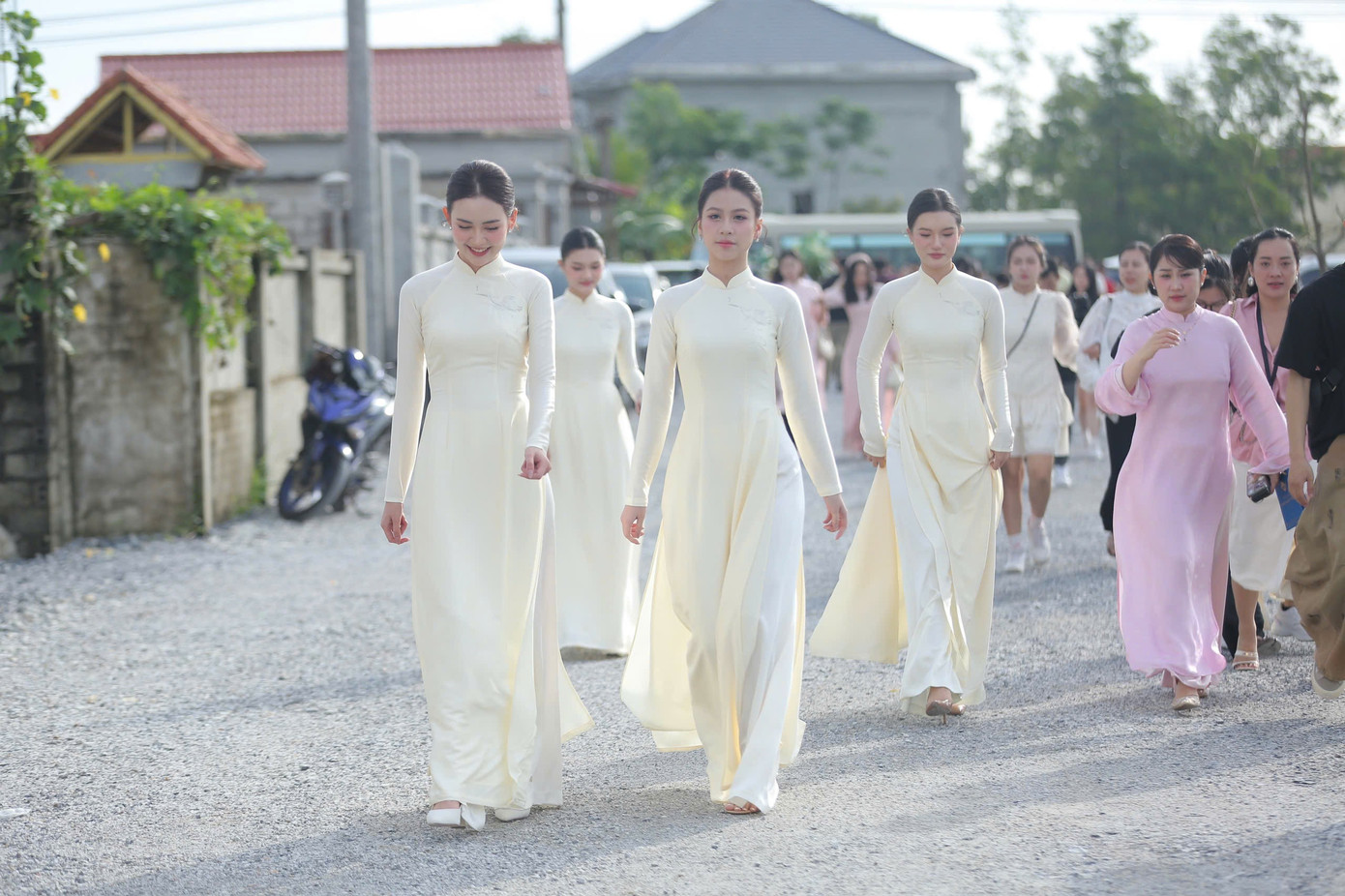 Đỗ Thị Hà xuất hiện với phong thái dịu dàng. Cô chọn áo dài trắng đơn giản, không đính kết quá cầu kỳ.
