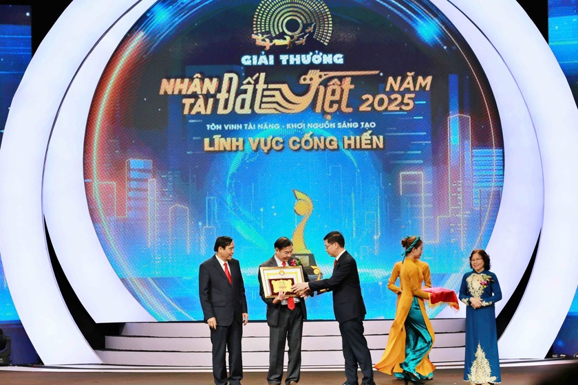 Anh hùng lao động Nguyễn Quang Mâu nhận Giải Cống hiến - Giải thưởng Nhân tài Đất Việt 2025. Ảnh: CDKH