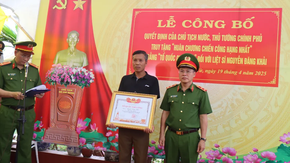 Trung tướng Nguyễn Văn Long, Thứ trưởng Bộ Công an trao Huân chương chiến công hạng Nhất và bằng Tổ quốc ghi công cho thân nhân Thiếu tá, liệt sĩ Nguyễn Đăng Khải ngày 19-4-2025. Ảnh: ĐẮC LAM