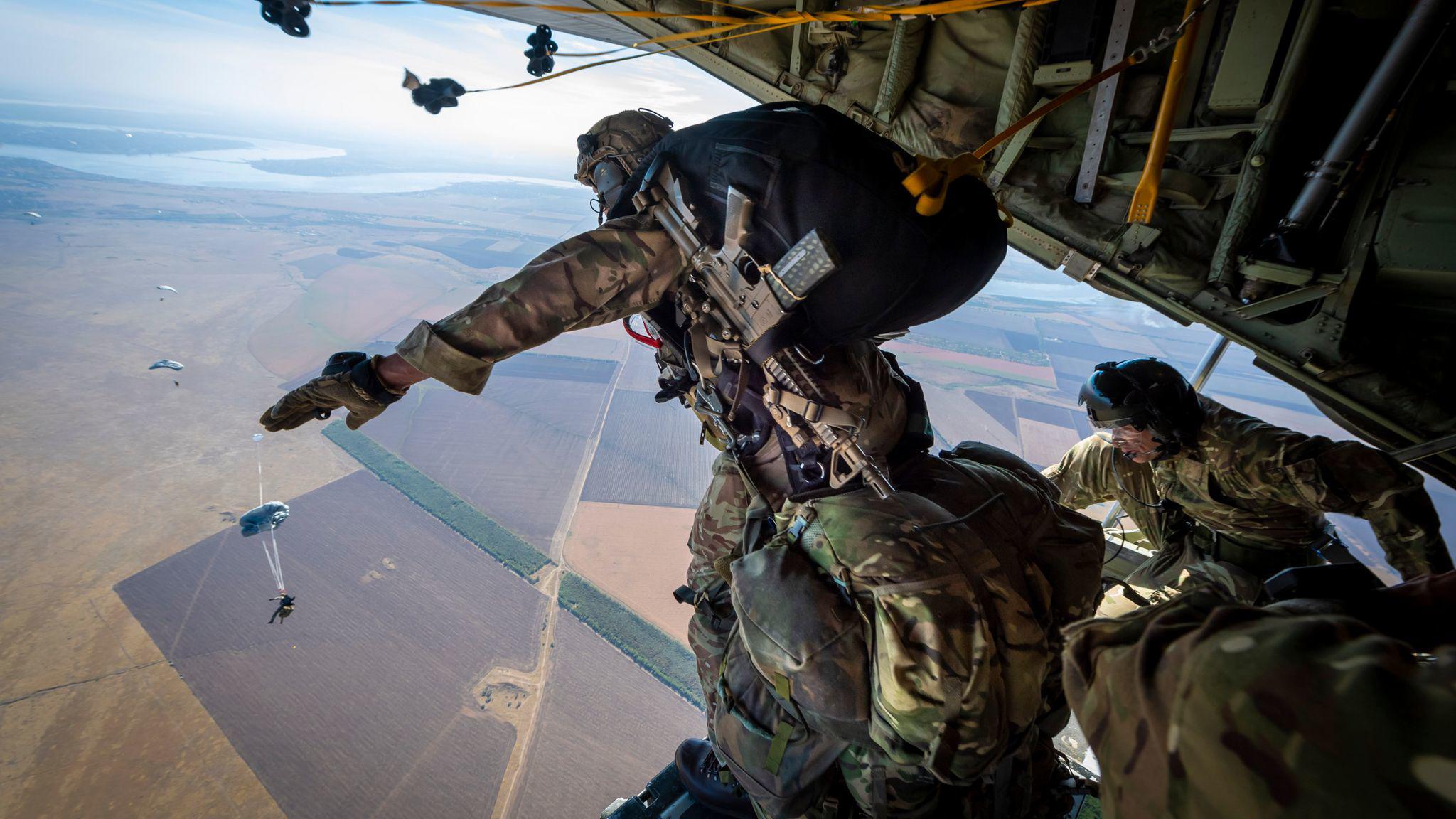 Binh sĩ Anh diễn tập nhảy dù từ máy bay ở Ukraine vào năm 2020. Ảnh: Sky News.