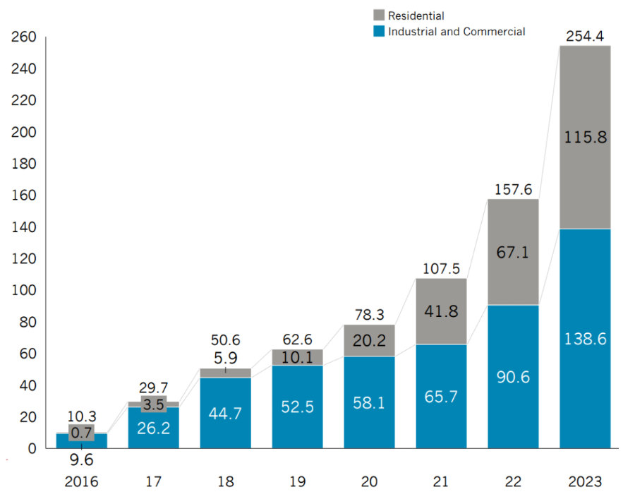 Tổng công suất điện mặt trời phân tán (PV) lắp đặt tại Trung Quốc ở khu dân cư và khu thương mại công nghiệp giai đoạn 2016-2023. Nguồn National Energy Administration, McKinsey