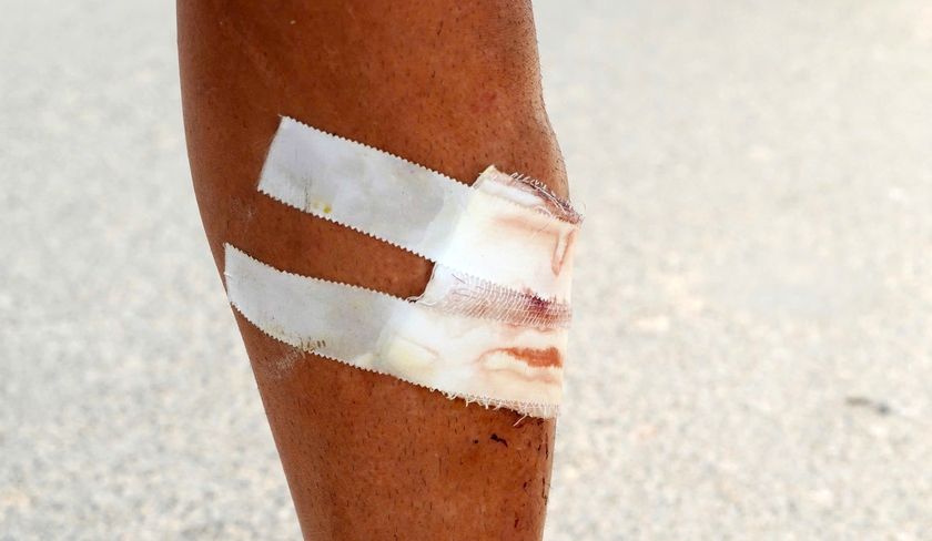 Chân trái của anh Nguyễn Trọng Khánh bị chấn thương và phải khâu 4 mũi sau khi cứu người. Ảnh: HQ
