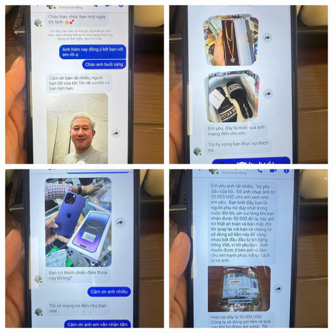 Bà V. kể lại, trước đó, thông qua mạng xã hội, bà được một đối tượng giả danh người nước ngoài làm quen, tạo quan hệ tình cảm. Gần đây, đối tượng gửi những hình ảnh quà kèm theo tiền trị giá 50.000USD gửi tặng bà V. để thể hiện tình yêu. Sau đó, đối tượng thông báo đang làm thủ tục đóng gói, vận chuyển quà về Việt Nam. Để nhận được số quà này, bà V. phải đến ngân hàng chuyển 5.000USD “tiền cước phí vận chuyển” vào số tài khoản do đối tượng cung cấp.