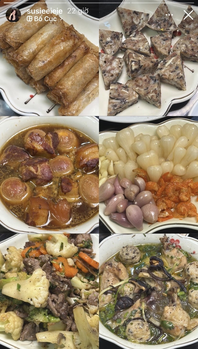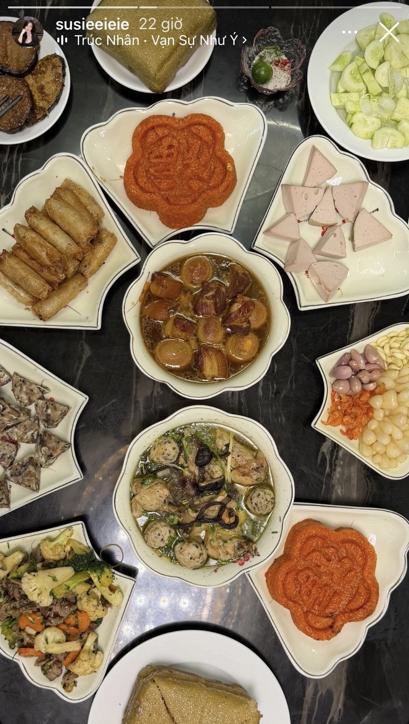Trong khi đó, Susie Phạm, em gái của Joyce Phạm, khoe mâm cỗ ngày Tết với những món ăn truyền thống như bánh chưng, nem rán, giò, canh mọc, dưa hành... Ảnh: susieeieie/Instagram.
