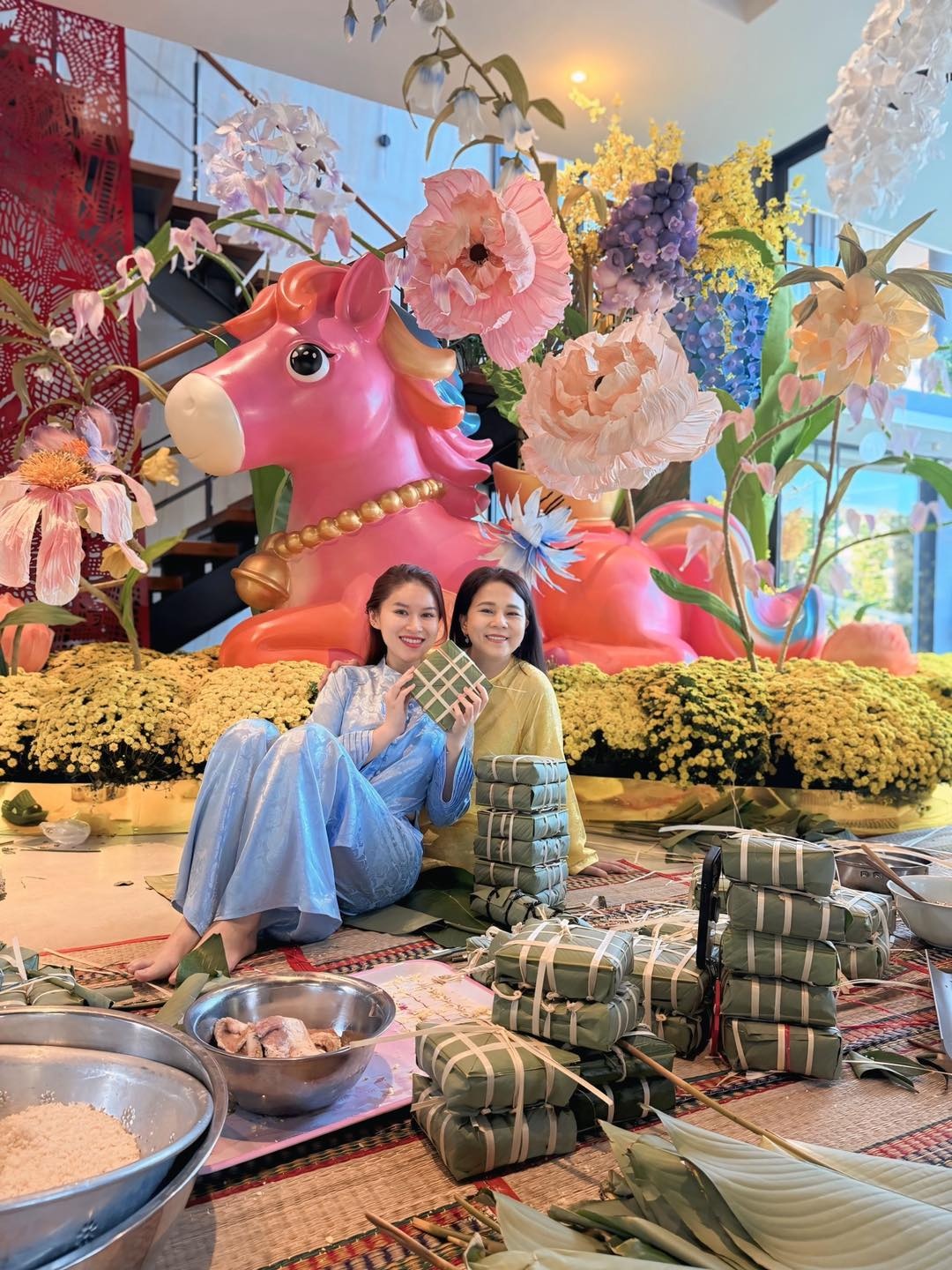 Trước thềm năm mới Bính Ngọ, rich kid Ngọc Thanh Tâm đăng bức ảnh "thành quả gói bánh chưng" cùng gia đình. Tuy nhiên, điểm nhấn khiến triệu người theo dõi trên trang cá nhân của cô nàng "trầm trồ" là khung cảnh bên trong biệt phủ ở Nha Trang. Chú ngựa hồng khổng lồ đặt giữa sảnh, trang trí xung quanh là những chậu cúc và các loại hoa giả decor. "Nhà riêng mà tưởng trung tâm thương mại luôn", "Thay vì Tết đi dạo đường hoa, cô ấy mang cả đường hoa về nhà"