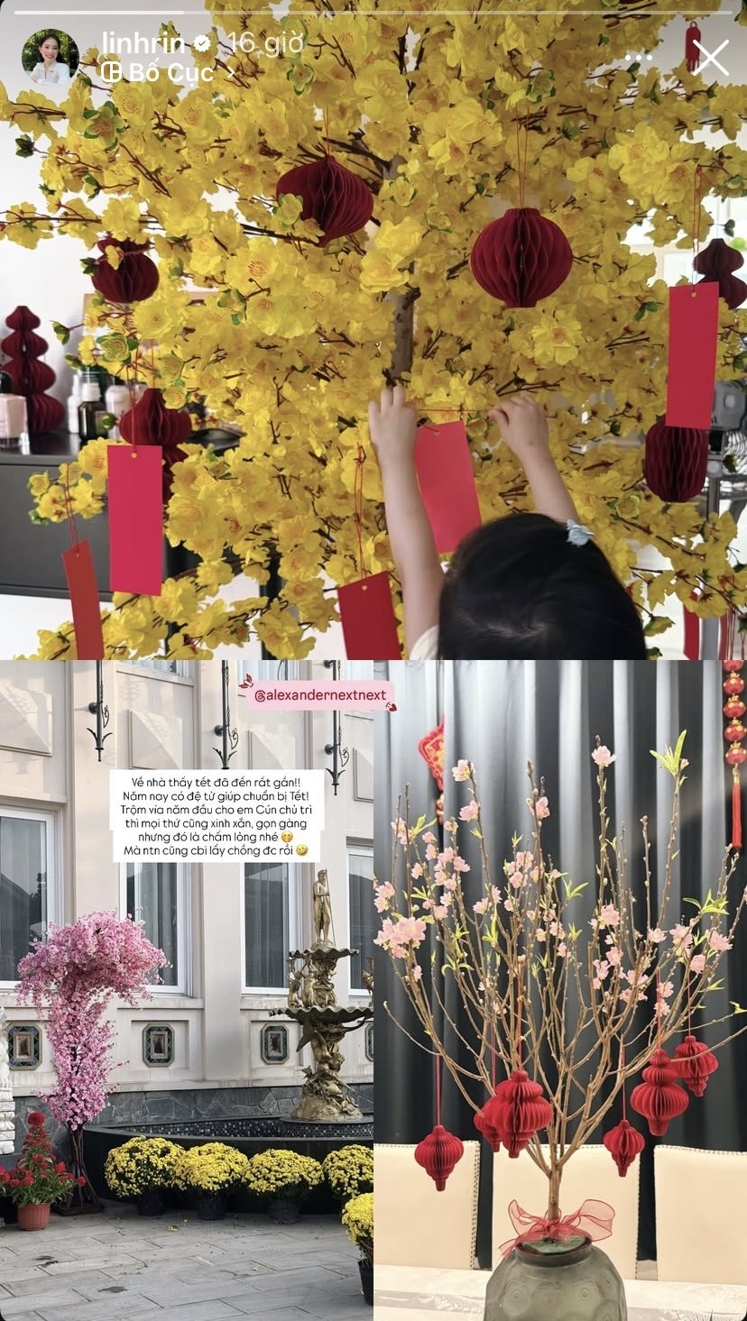 Linh Rin, con dâu của tỷ phú Johnathan Hạnh Nguyễn, chia sẻ những khung hình rực rỡ trong biệt thự ngày Tết. Mỗi góc trong và ngoài nhà đều đầy ắp sắc hoa, từ đào, mai đến cúc vàng. Ảnh: linhrin/Instagram.