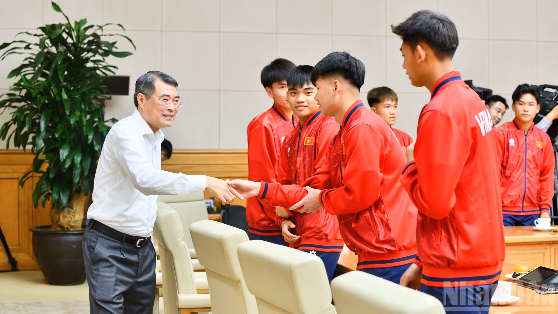 Thủ tướng Lê Minh Hưng bắt tay chúc mừng Ban lãnh đạo Đội tuyển bóng đá nam U17 quốc gia Việt Nam. (Ảnh: Thanh Giang)
