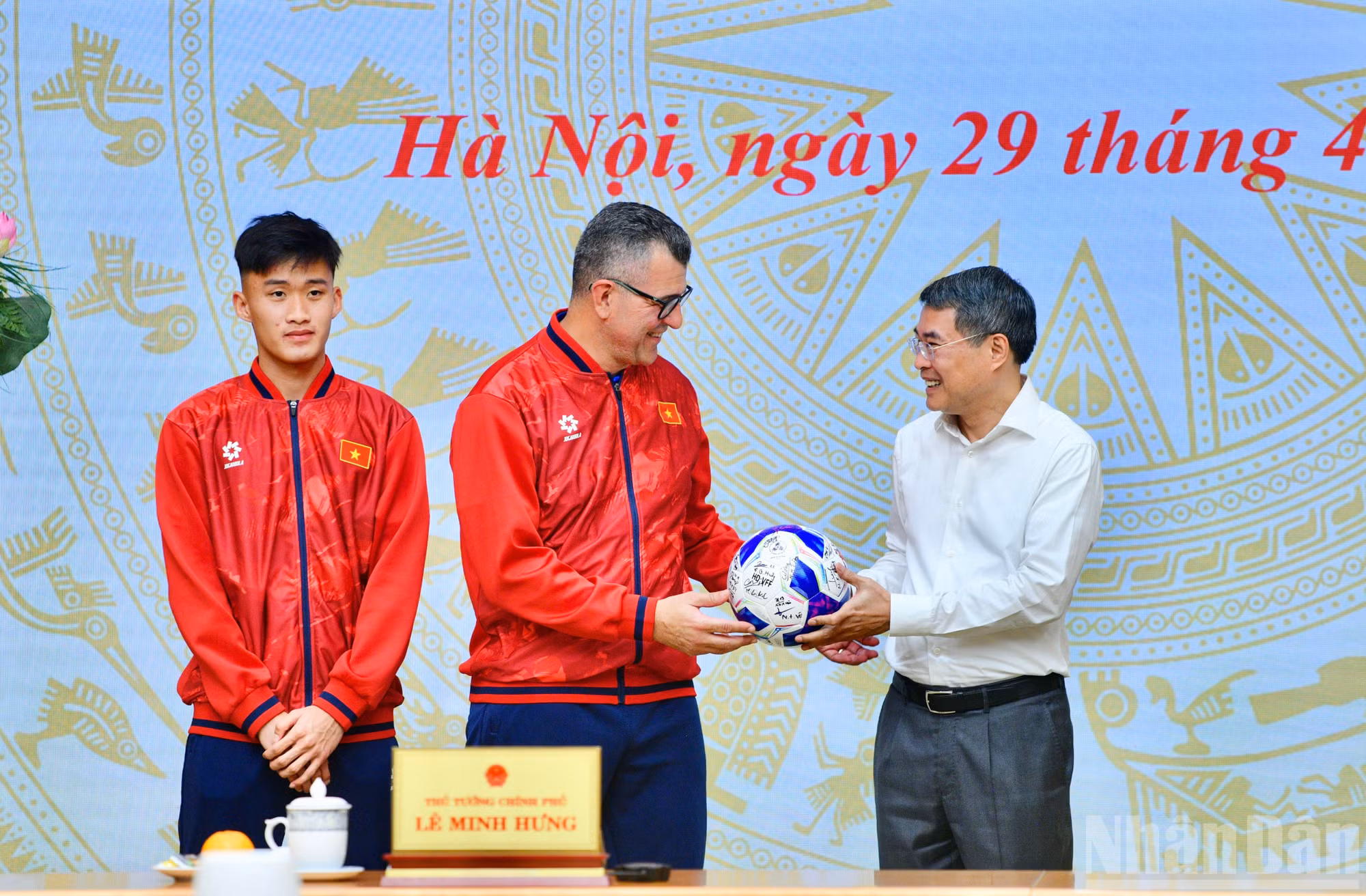 Thủ tướng Lê Minh Hưng nhận quà lưu niệm là quả bóng thi đấu có chữ ký của toàn đội tuyển. (Ảnh: Thanh Giang)