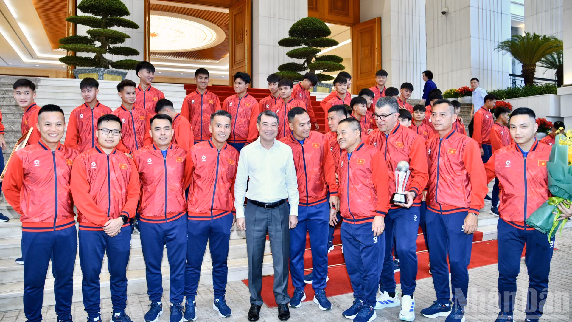 Thủ tướng Lê Minh Hưng với một số thành viên Ban huấn luyện và cầu thủ đội tuyển. (Ảnh: Thanh Giang)